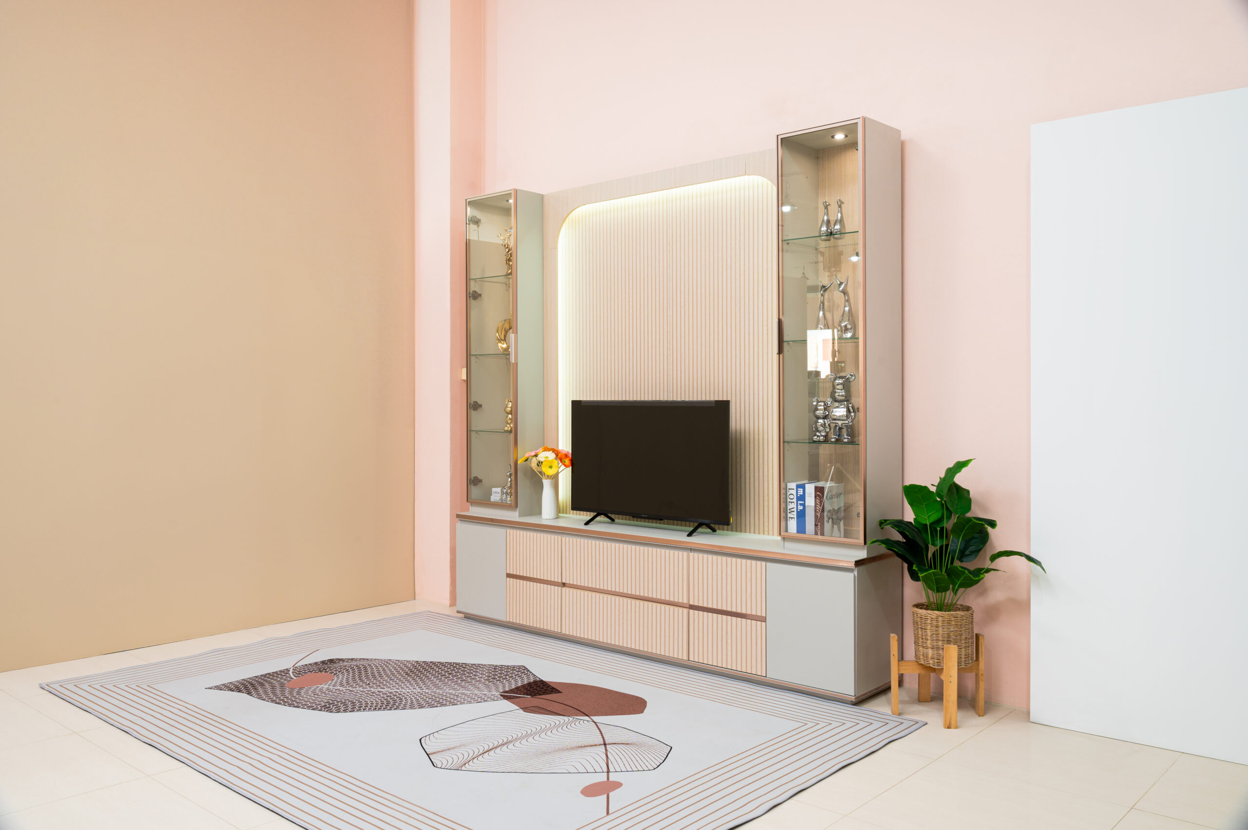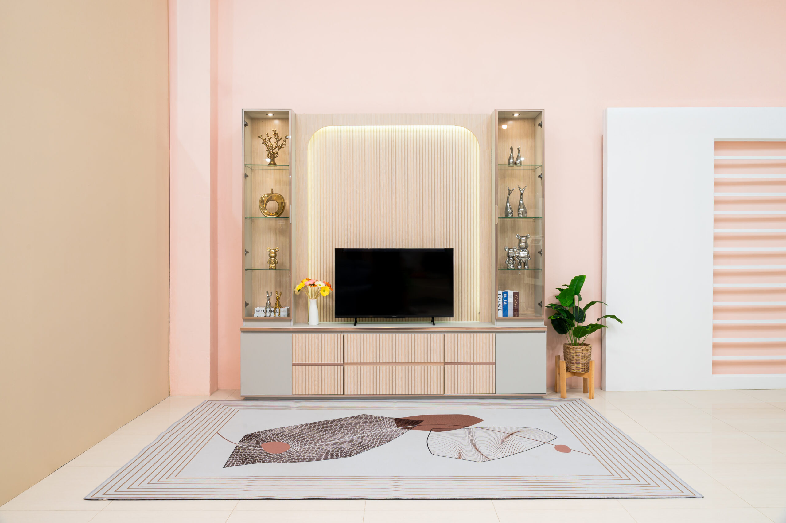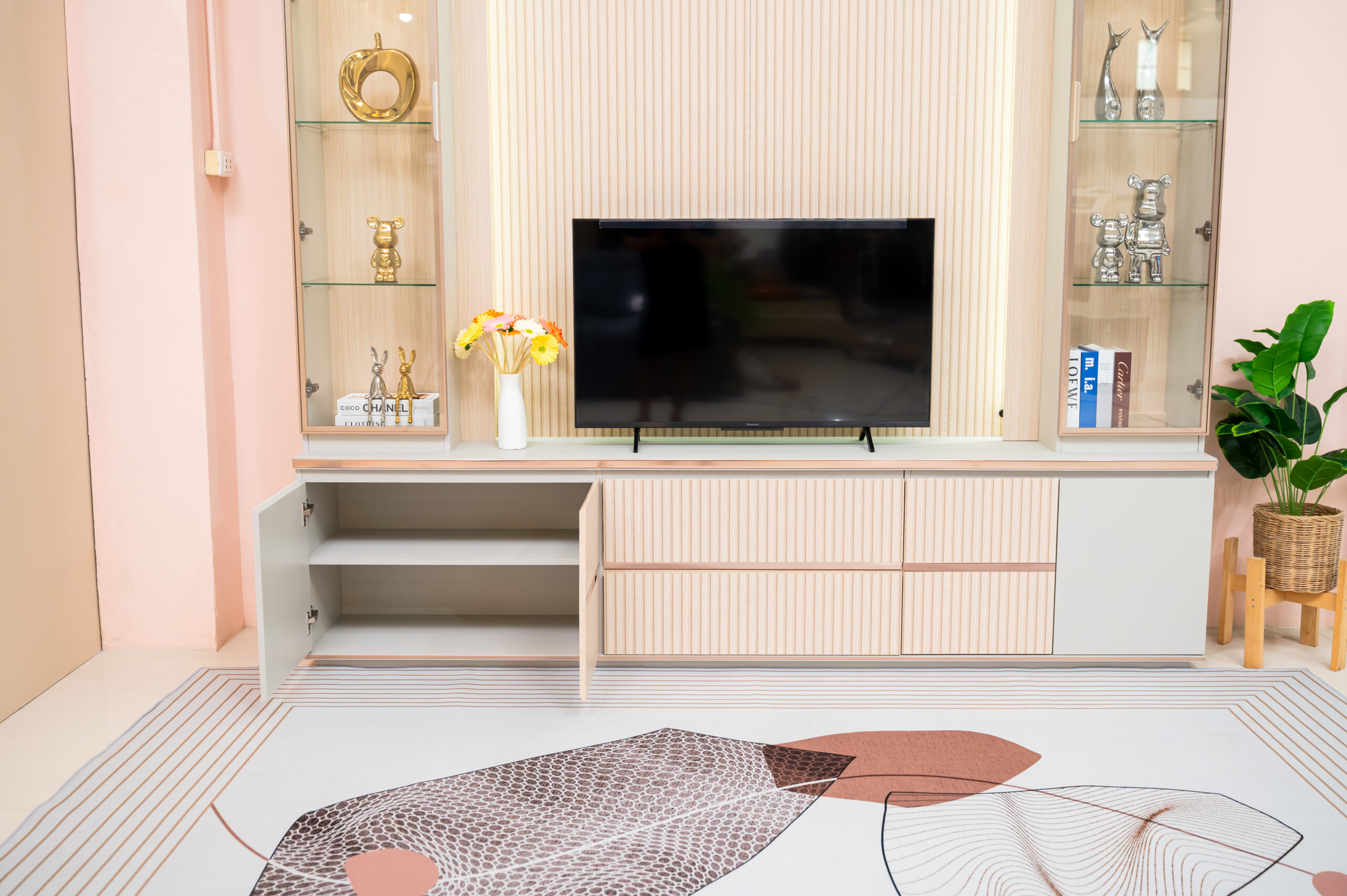 เนรมิตผนังห้องนั่งเล่นให้กลายเป็นจุดสนใจที่สวยงามและใช้งานได้จริง ด้วยชั้นวางทีวีขนาดใหญ่ดีไซน์หรูหราที่ผสานเส้นสายความโค้งมนของซุ้มประตู (Arch Shape) เข้ากับลวดลายไม้เซาะร่องแนวตั้งสีอ่อน ให้ความรู้สึกอบอุ่น สบายตา แต่แฝงไปด้วยความทันสมัย มาพร้อมตู้โชว์กระจกใสขนาบข้าง 2 ฝั่ง ที่ติดตั้งไฟ LED ภายใน ช่วยขับเน้นของสะสมชิ้นโปรดให้ดูโดดเด่นและมีคุณค่า ด้านล่างออกแบบเป็นตู้ลิ้นชักและตู้บานเปิดระบบ Soft Close สำหรับจัดเก็บอุปกรณ์ต่างๆ ได้อย่างเป็นระเบียบ ตอบโจทย์การใช้งานครบครันทั้งโชว์และเก็บในชิ้นเดียว