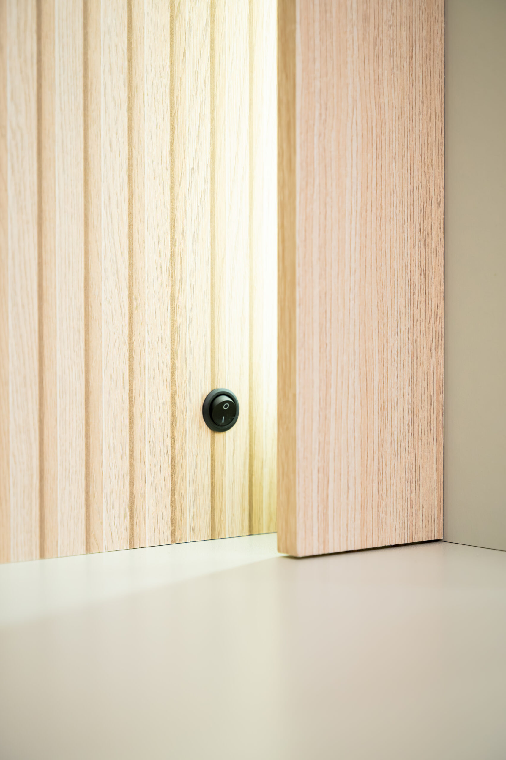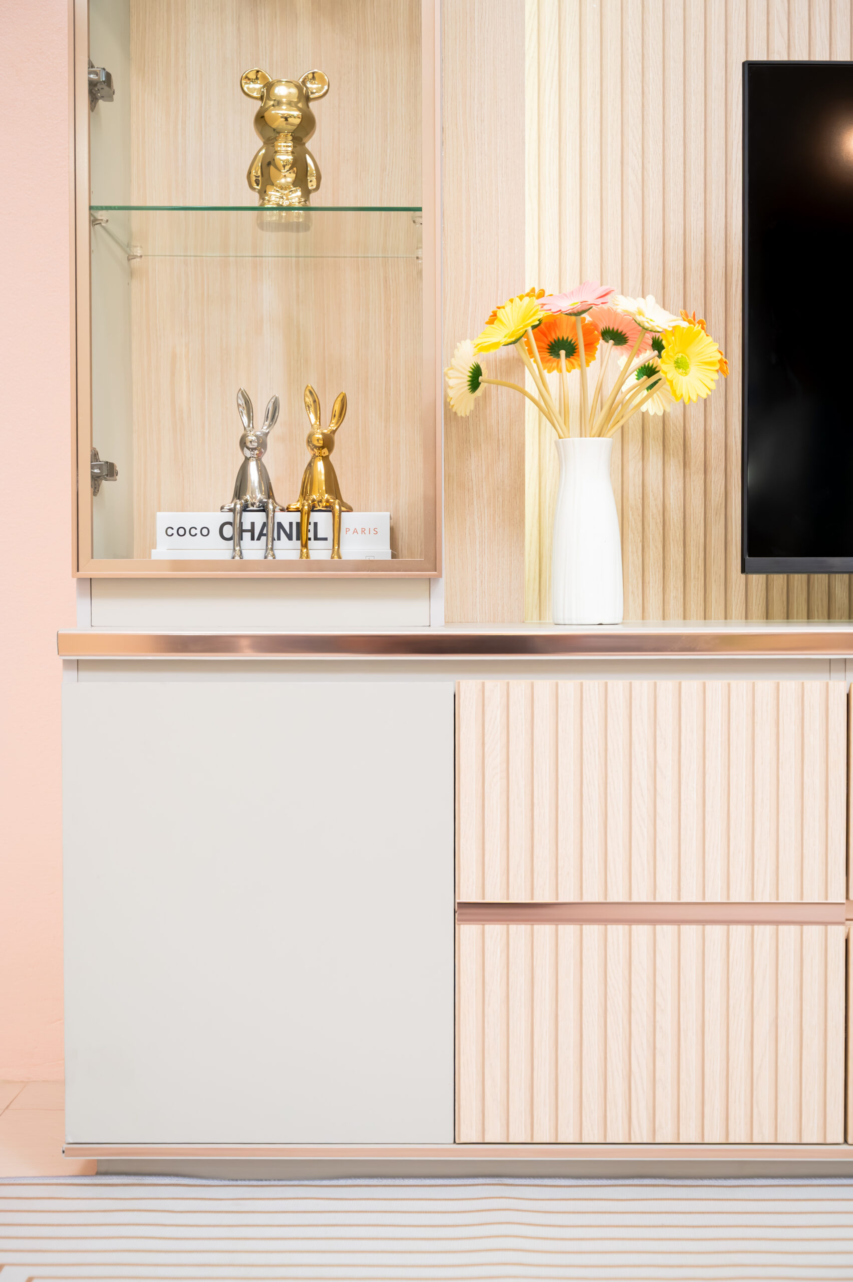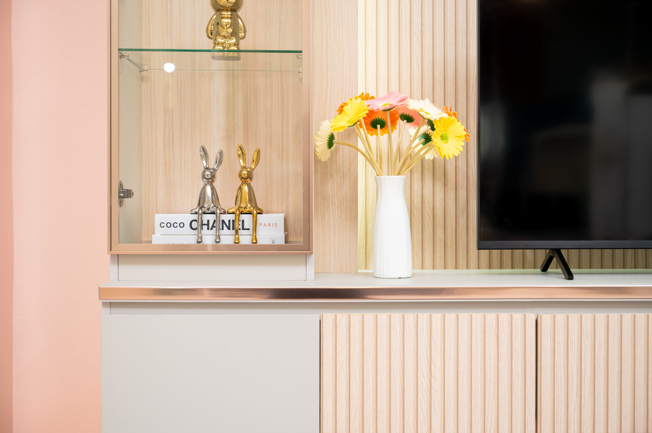 เนรมิตผนังห้องนั่งเล่นให้กลายเป็นจุดสนใจที่สวยงามและใช้งานได้จริง ด้วยชั้นวางทีวีขนาดใหญ่ดีไซน์หรูหราที่ผสานเส้นสายความโค้งมนของซุ้มประตู (Arch Shape) เข้ากับลวดลายไม้เซาะร่องแนวตั้งสีอ่อน ให้ความรู้สึกอบอุ่น สบายตา แต่แฝงไปด้วยความทันสมัย มาพร้อมตู้โชว์กระจกใสขนาบข้าง 2 ฝั่ง ที่ติดตั้งไฟ LED ภายใน ช่วยขับเน้นของสะสมชิ้นโปรดให้ดูโดดเด่นและมีคุณค่า ด้านล่างออกแบบเป็นตู้ลิ้นชักและตู้บานเปิดระบบ Soft Close สำหรับจัดเก็บอุปกรณ์ต่างๆ ได้อย่างเป็นระเบียบ ตอบโจทย์การใช้งานครบครันทั้งโชว์และเก็บในชิ้นเดียว