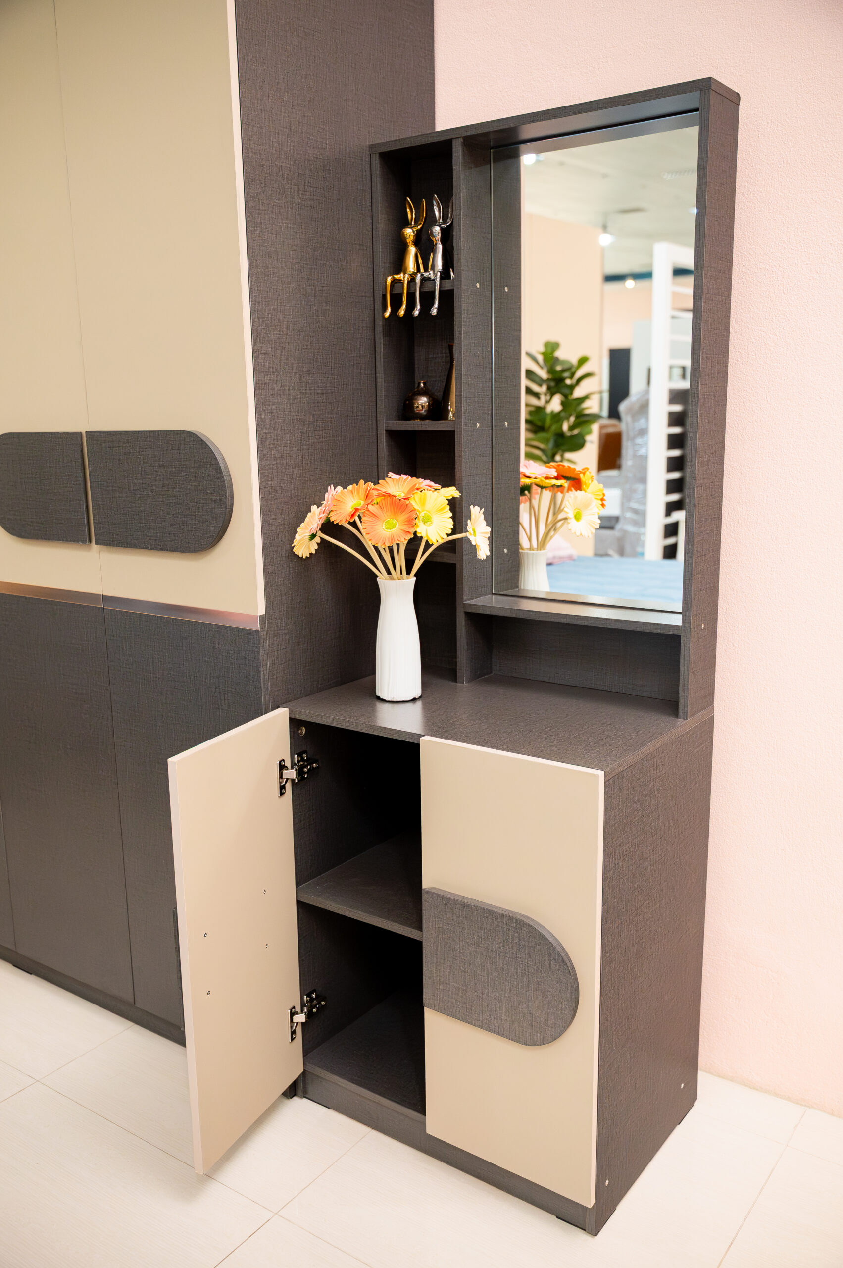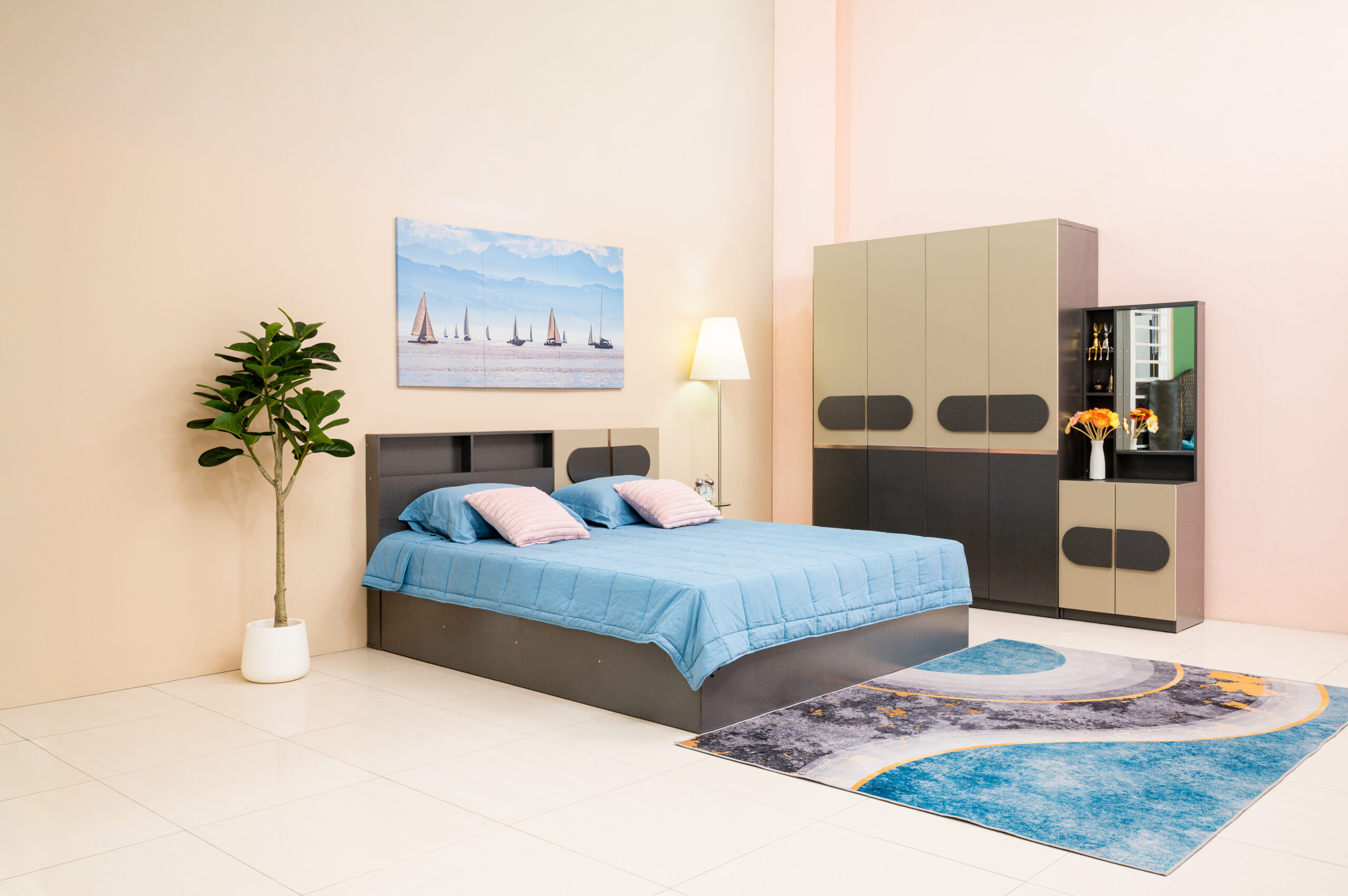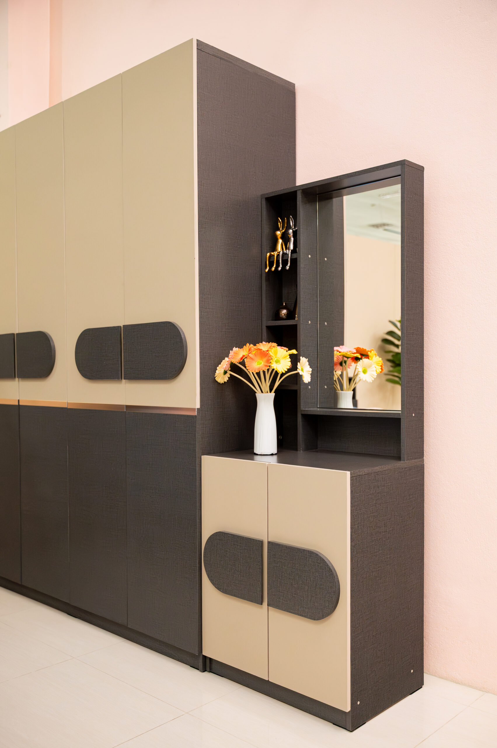 สะท้อนรสนิยมความทันสมัยผ่านชุดห้องนอนดีไซน์ Geometric ที่โดดเด่นด้วยการเล่นคู่สีทูโทน ระหว่างงานไม้สีเทาเข้มสุดเท่ตัดกับสีเบจละมุนตา สร้างมิติให้ห้องดูไม่ทึบจนเกินไป เอกลักษณ์สำคัญอยู่ที่ดีไซน์หน้าบานและมือจับรูปทรงแคปซูล (Capsule Shape) ที่เชื่อมโยงความรู้สึกของเฟอร์นิเจอร์ทุกชิ้นให้เป็นหนึ่งเดียวกัน เสริมความพรีเมียมด้วยเส้นสายคิ้วอลูมิเนียมสีทองแดงคาดกลางตู้เสื้อผ้า มาพร้อมฟังก์ชันหัวเตียงที่มีช่องเก็บของในตัวและชุดโต๊ะเครื่องแป้งแบบยืนที่จัดเก็บของได้จุใจ เป็นการผสมผสานความเท่และประโยชน์ใช้สอยที่ลงตัวสำหรับคนรุ่นใหม่