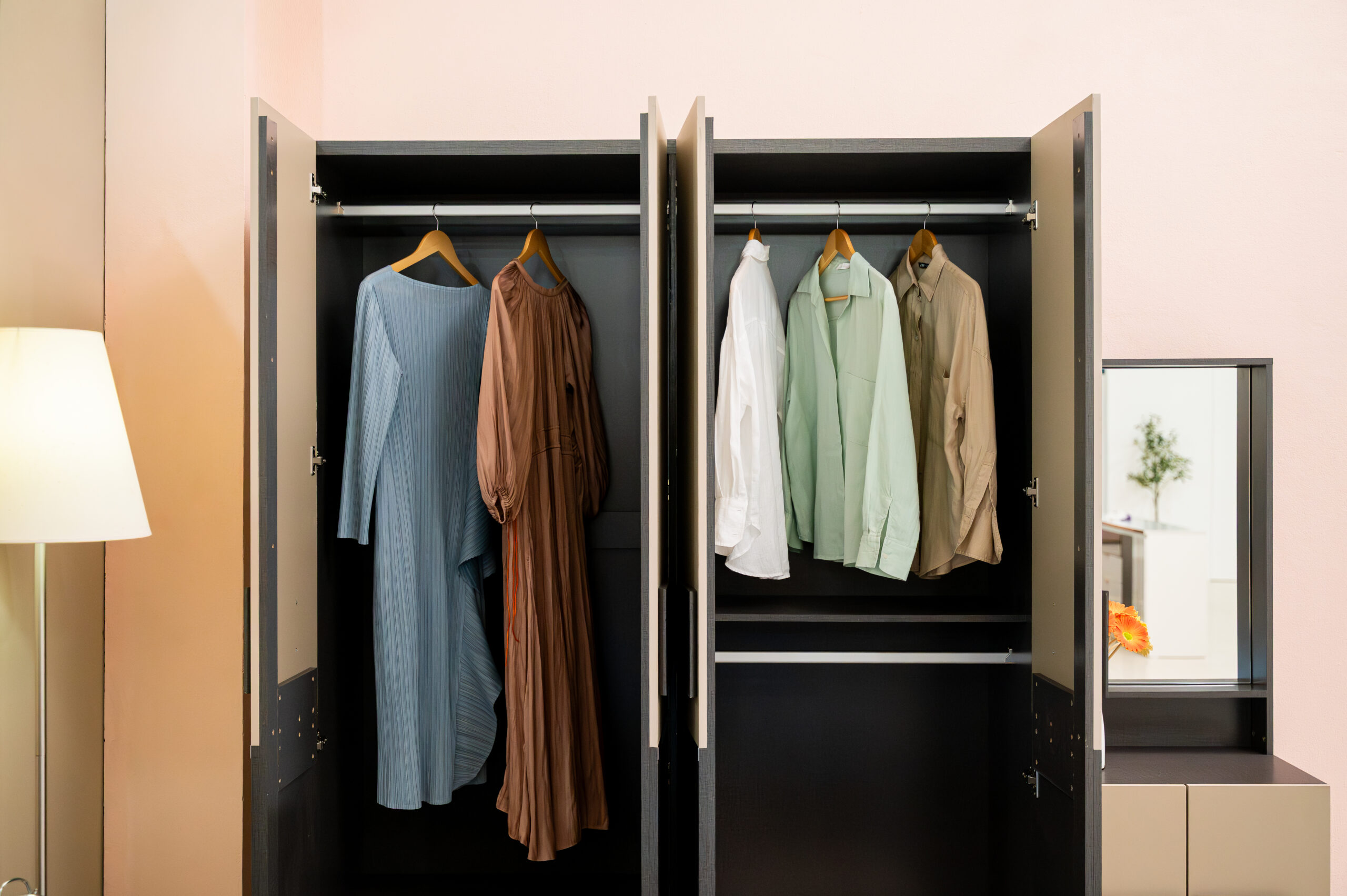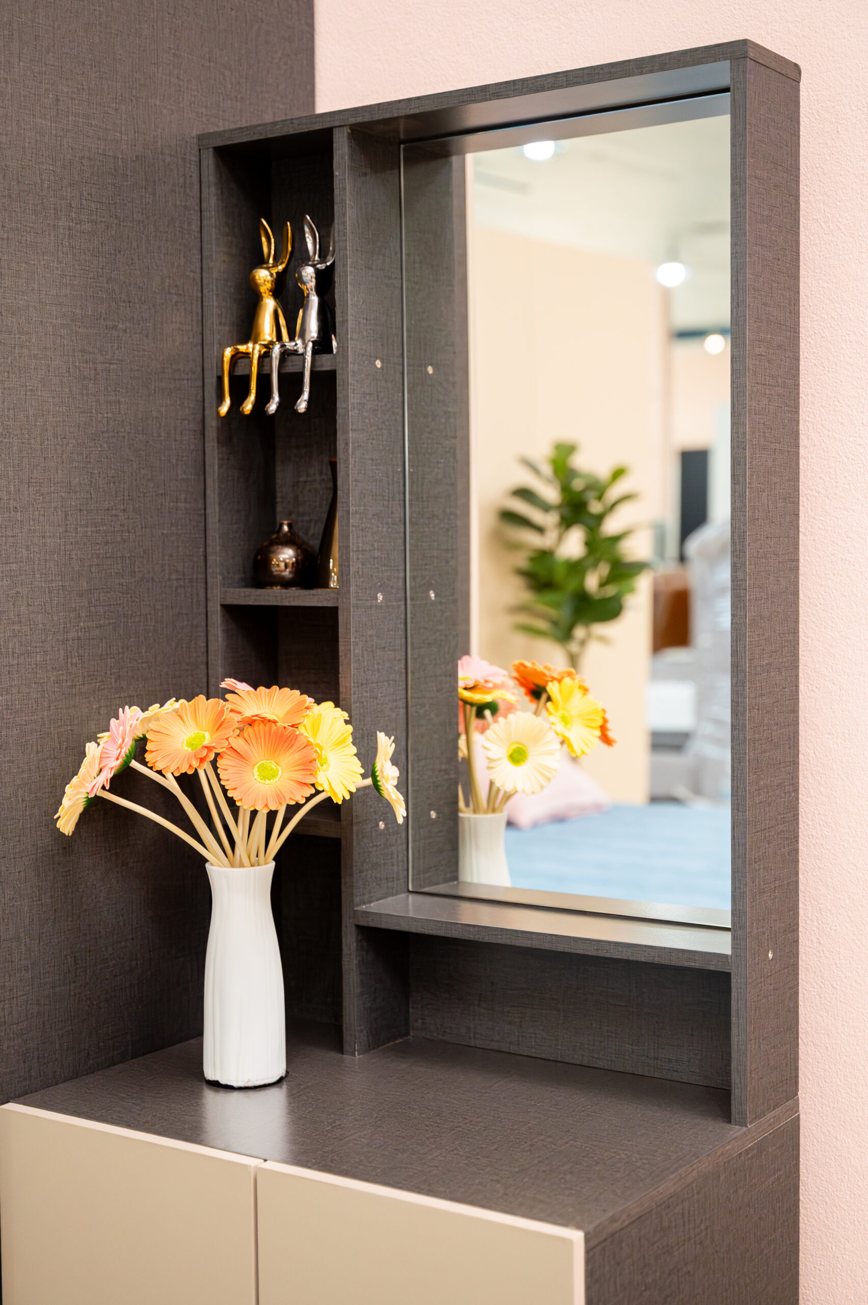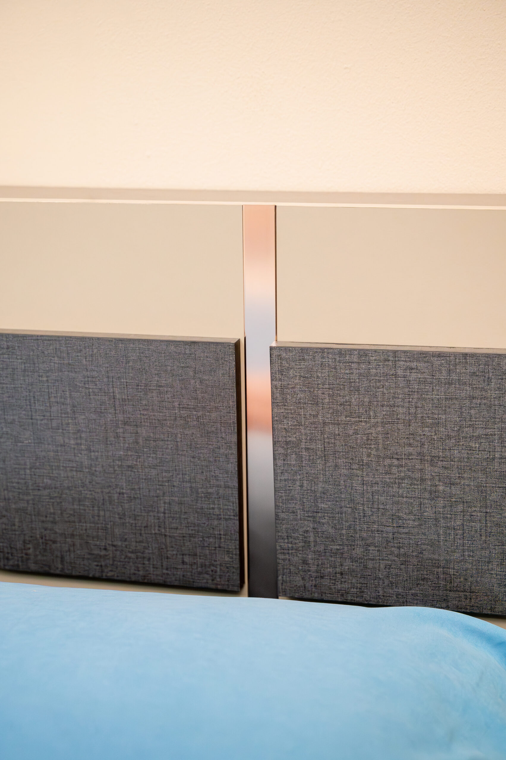 สะท้อนรสนิยมความทันสมัยผ่านชุดห้องนอนดีไซน์ Geometric ที่โดดเด่นด้วยการเล่นคู่สีทูโทน ระหว่างงานไม้สีเทาเข้มสุดเท่ตัดกับสีเบจละมุนตา สร้างมิติให้ห้องดูไม่ทึบจนเกินไป เอกลักษณ์สำคัญอยู่ที่ดีไซน์หน้าบานและมือจับรูปทรงแคปซูล (Capsule Shape) ที่เชื่อมโยงความรู้สึกของเฟอร์นิเจอร์ทุกชิ้นให้เป็นหนึ่งเดียวกัน เสริมความพรีเมียมด้วยเส้นสายคิ้วอลูมิเนียมสีทองแดงคาดกลางตู้เสื้อผ้า มาพร้อมฟังก์ชันหัวเตียงที่มีช่องเก็บของในตัวและชุดโต๊ะเครื่องแป้งแบบยืนที่จัดเก็บของได้จุใจ เป็นการผสมผสานความเท่และประโยชน์ใช้สอยที่ลงตัวสำหรับคนรุ่นใหม่