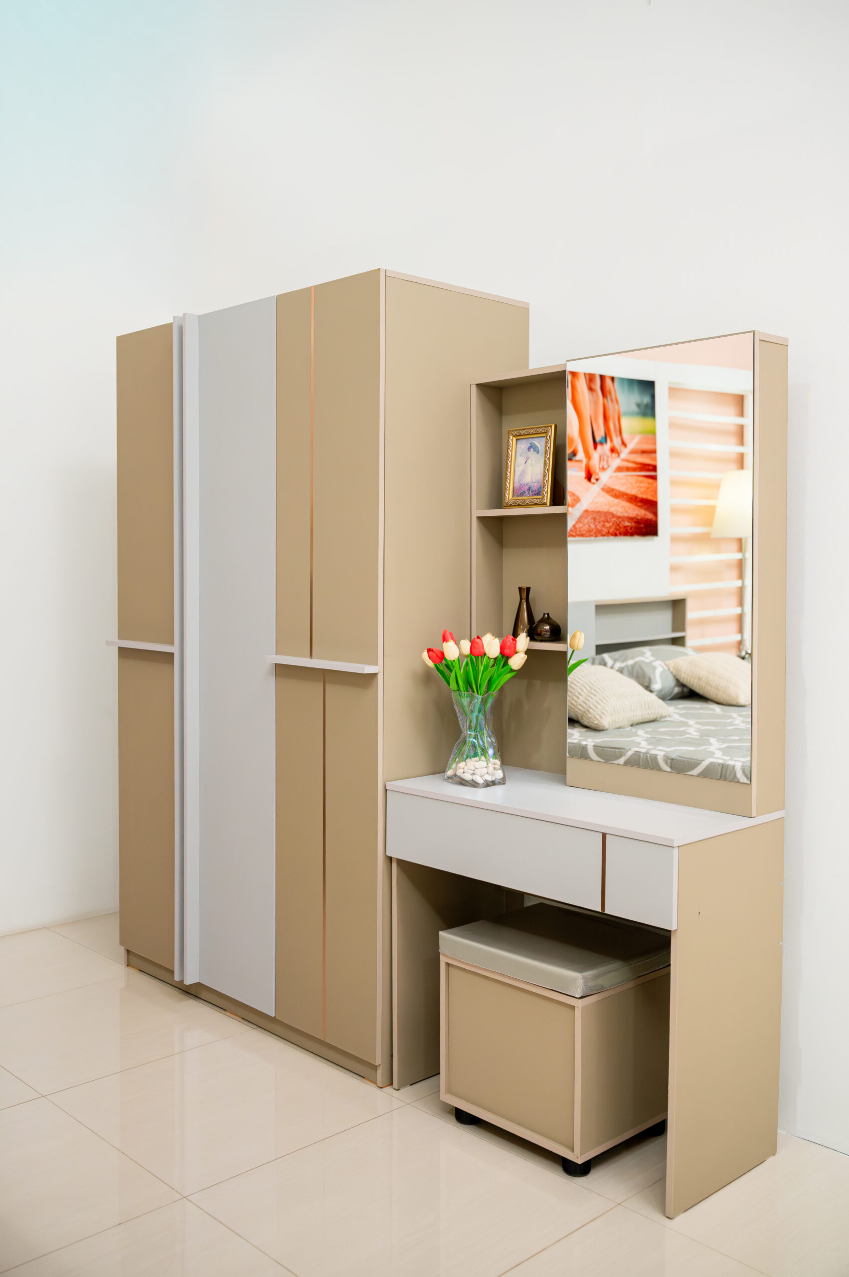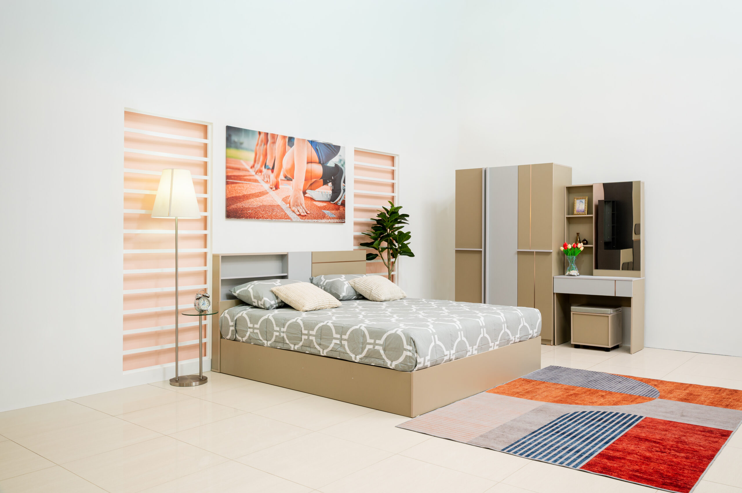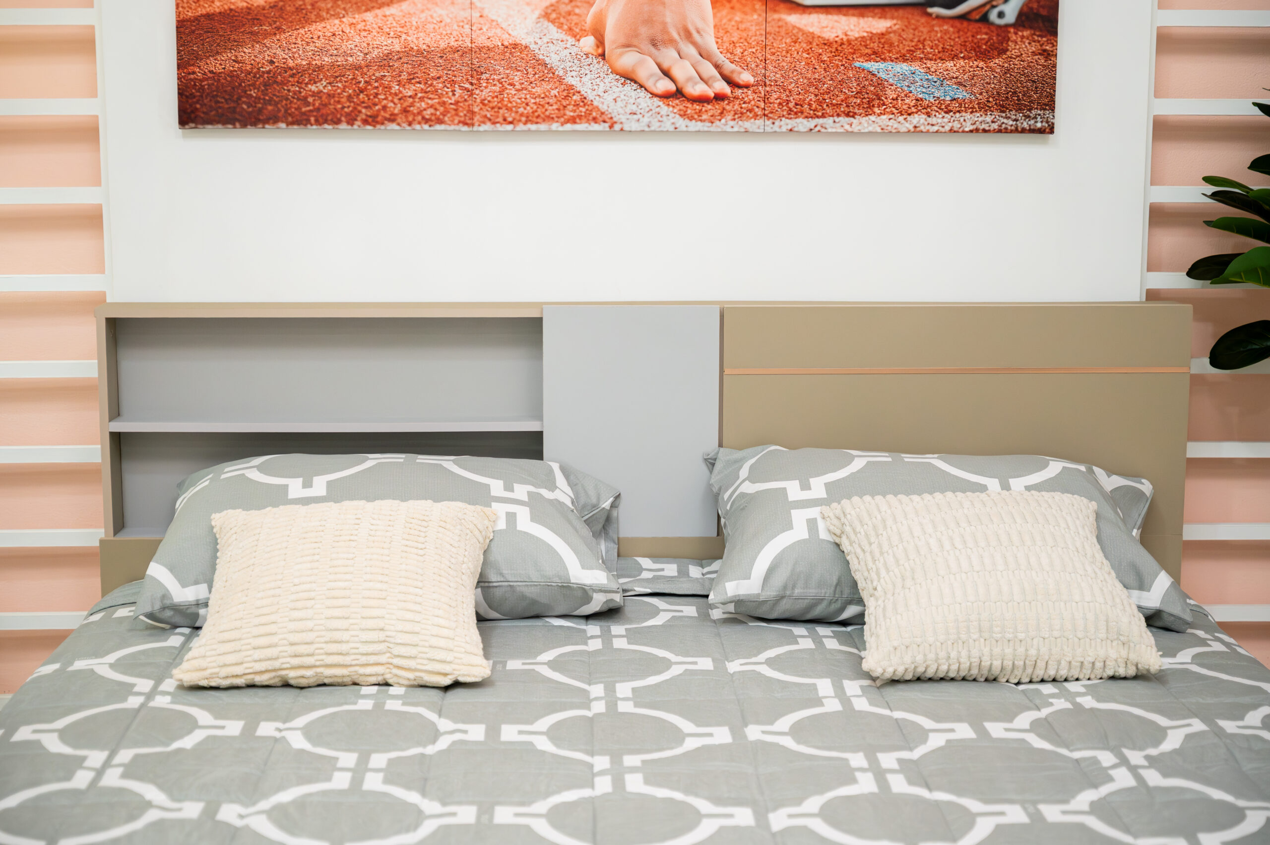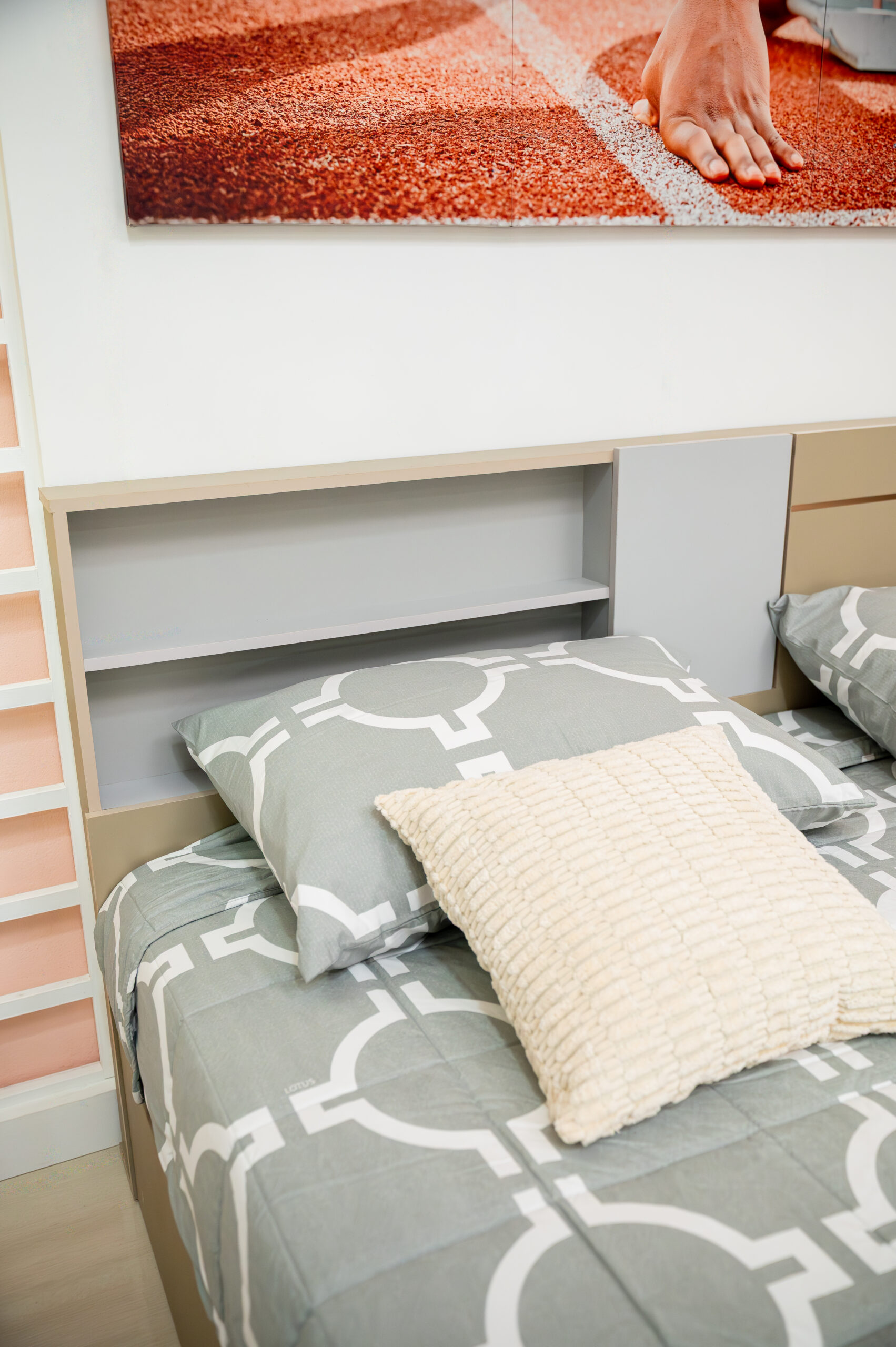 เนรมิตบรรยากาศห้องนอนให้ดูอบอุ่นและสบายตาด้วยชุดเฟอร์นิเจอร์ห้องนอนครบเซ็ตที่โดดเด่นด้วยการจับคู่สีทูโทน ระหว่างสีไม้โทนเบจธรรมชาติตัดสลับกับสีเทาอ่อน ให้ความรู้สึกละมุนและทันสมัยในเวลาเดียวกัน ดีไซน์เน้นเส้นสายที่เรียบง่ายแต่ตอบโจทย์การใช้งานจริง เริ่มจากเตียงนอนที่มีหัวเตียงฟังก์ชันพิเศษ เจาะช่องวางของสำหรับเก็บหนังสือหรือวางโทรศัพท์มือถือ ช่วยจัดระเบียบพื้นที่หัวเตียงไม่ให้รกสายตา มาพร้อมตู้เสื้อผ้าขนาดใหญ่และชุดโต๊ะเครื่องแป้งเข้าชุดที่มีทั้งกระจกบานใหญ่และชั้นวางของโชว์ เป็นการคุมโทนห้องนอนให้สวยเป๊ะลงตัวทั้งดีไซน์และการใช้งาน