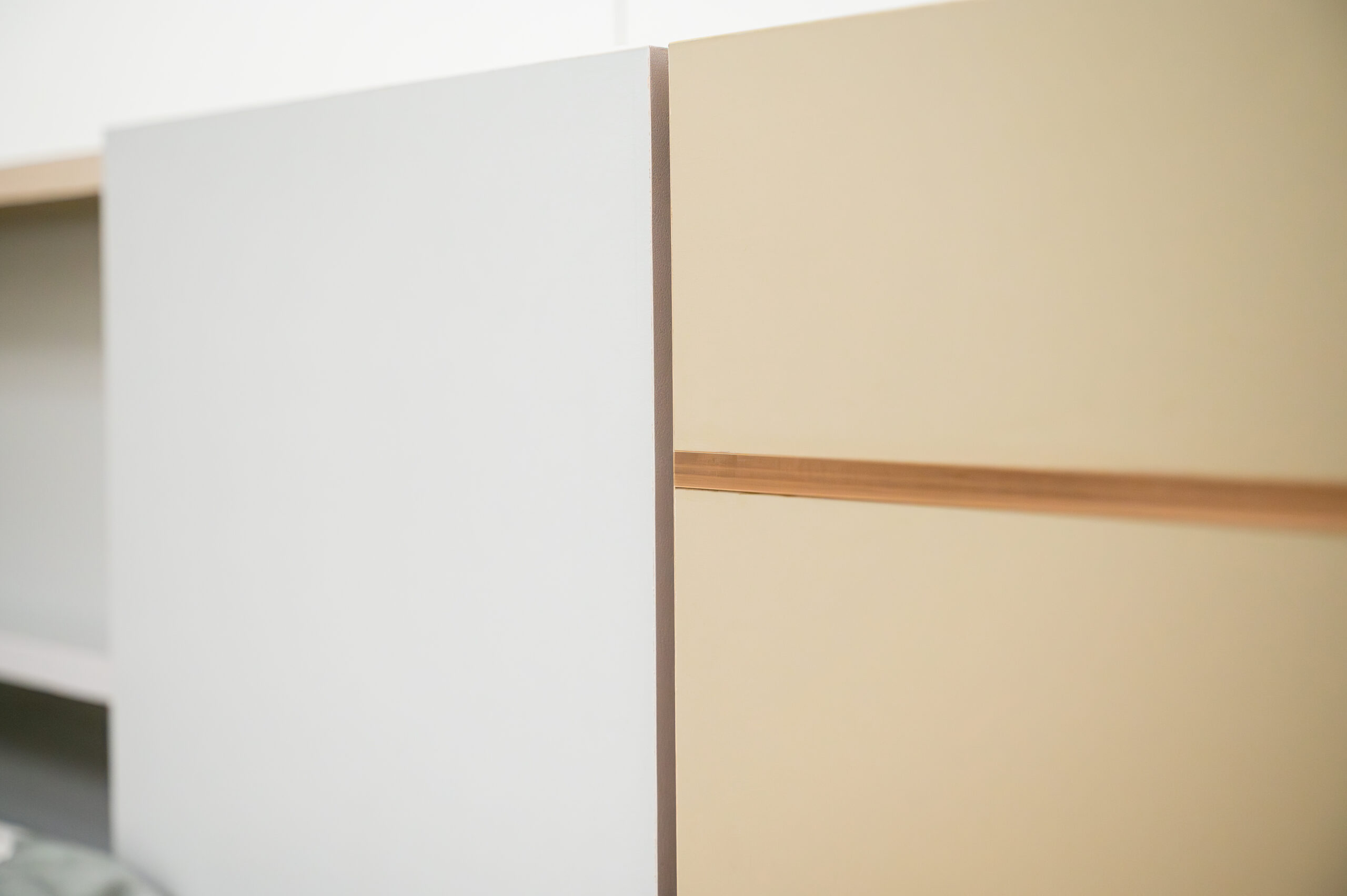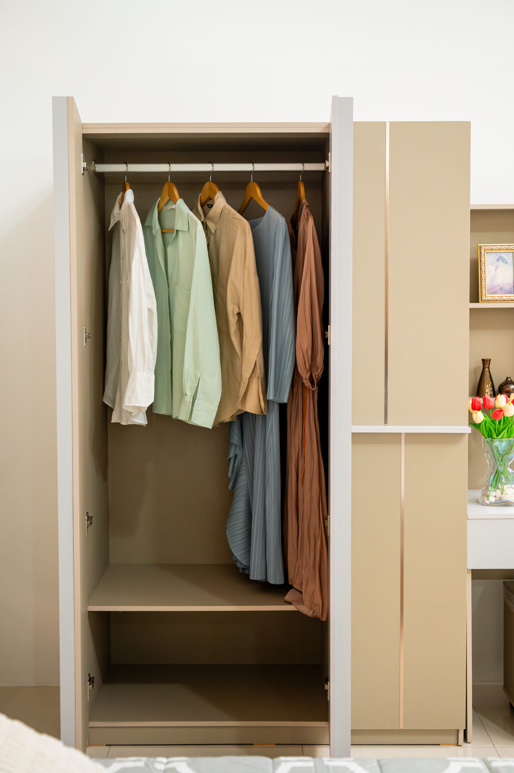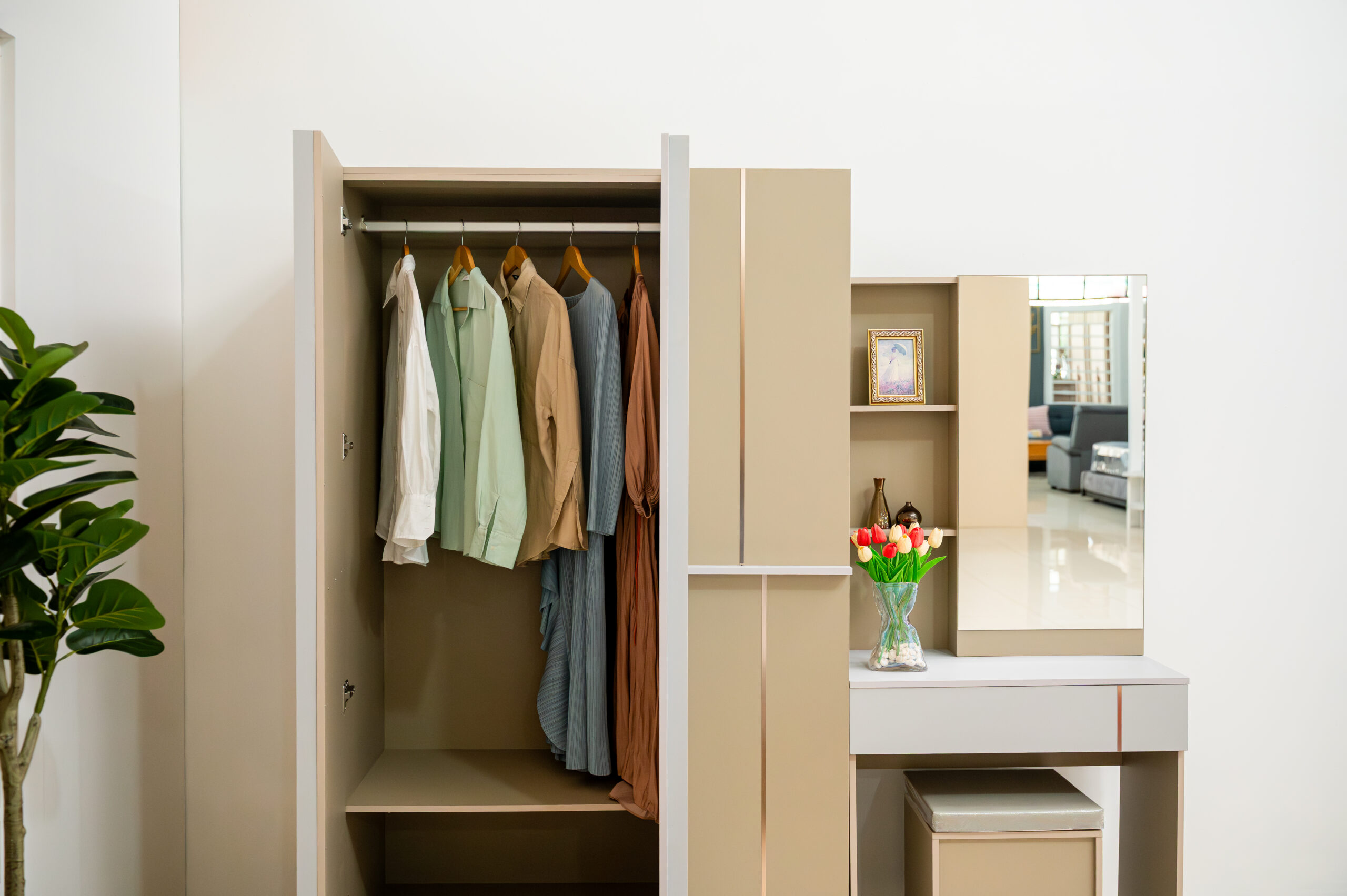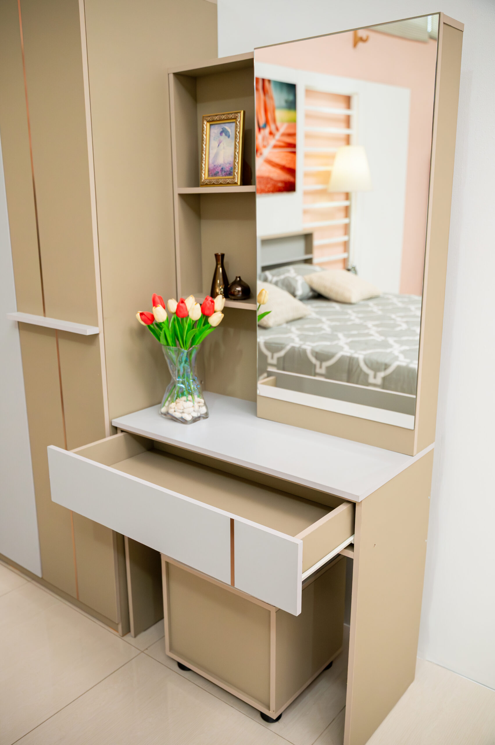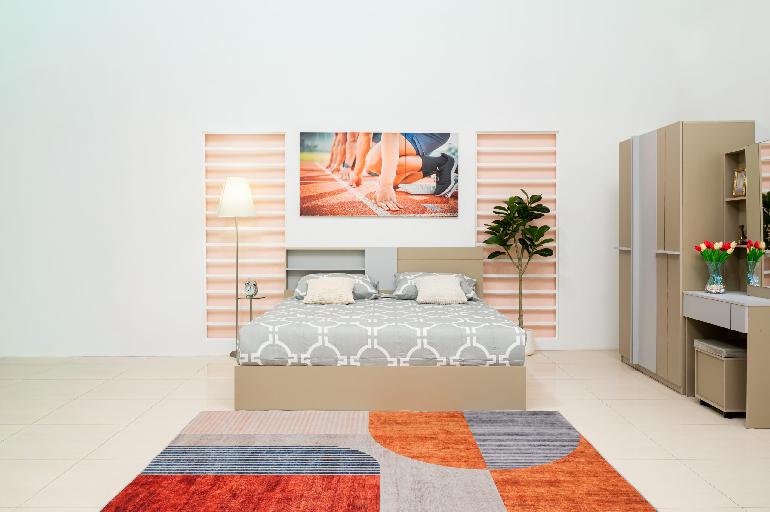เนรมิตบรรยากาศห้องนอนให้ดูอบอุ่นและสบายตาด้วยชุดเฟอร์นิเจอร์ห้องนอนครบเซ็ตที่โดดเด่นด้วยการจับคู่สีทูโทน ระหว่างสีไม้โทนเบจธรรมชาติตัดสลับกับสีเทาอ่อน ให้ความรู้สึกละมุนและทันสมัยในเวลาเดียวกัน ดีไซน์เน้นเส้นสายที่เรียบง่ายแต่ตอบโจทย์การใช้งานจริง เริ่มจากเตียงนอนที่มีหัวเตียงฟังก์ชันพิเศษ เจาะช่องวางของสำหรับเก็บหนังสือหรือวางโทรศัพท์มือถือ ช่วยจัดระเบียบพื้นที่หัวเตียงไม่ให้รกสายตา มาพร้อมตู้เสื้อผ้าขนาดใหญ่และชุดโต๊ะเครื่องแป้งเข้าชุดที่มีทั้งกระจกบานใหญ่และชั้นวางของโชว์ เป็นการคุมโทนห้องนอนให้สวยเป๊ะลงตัวทั้งดีไซน์และการใช้งาน