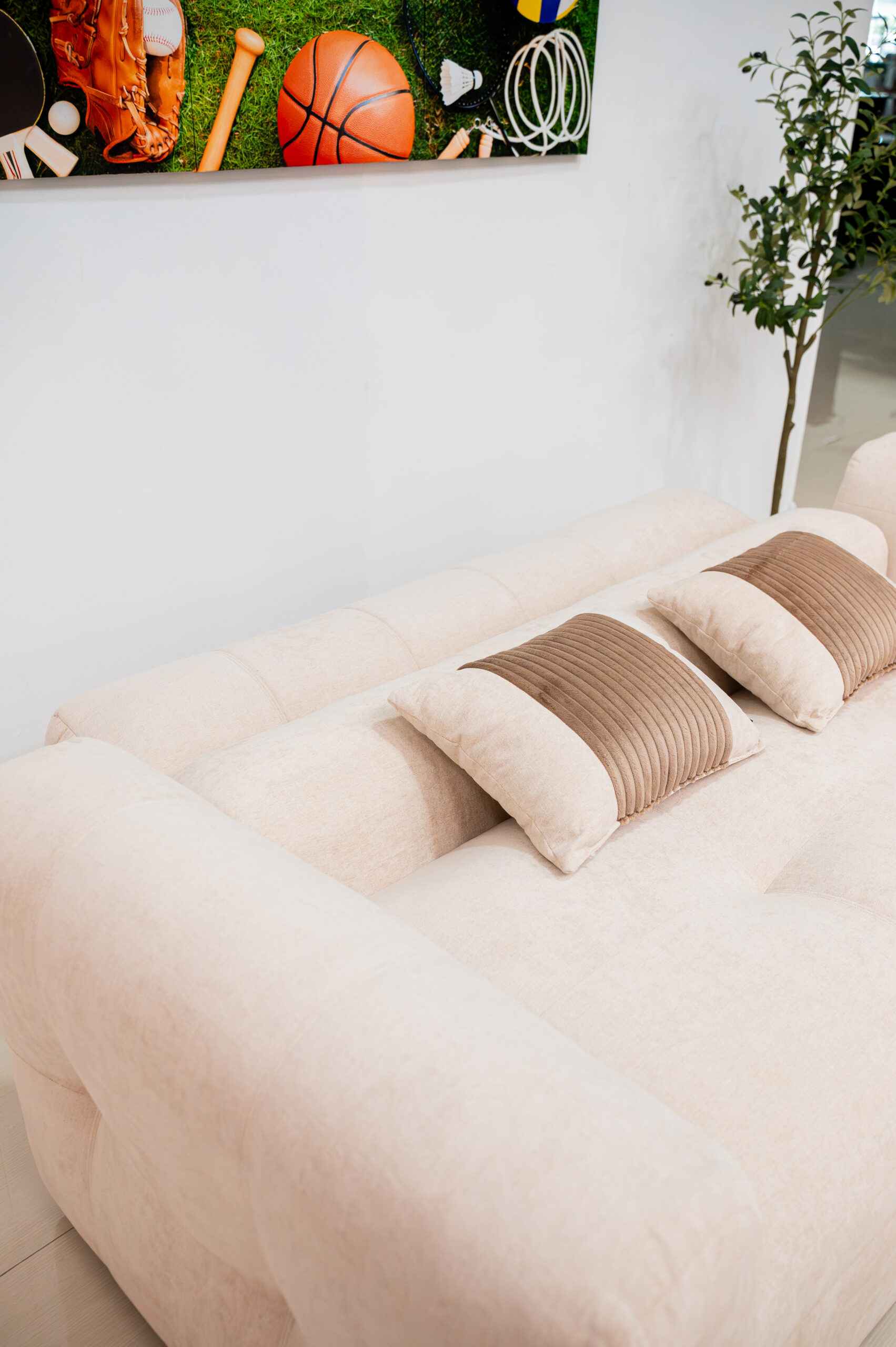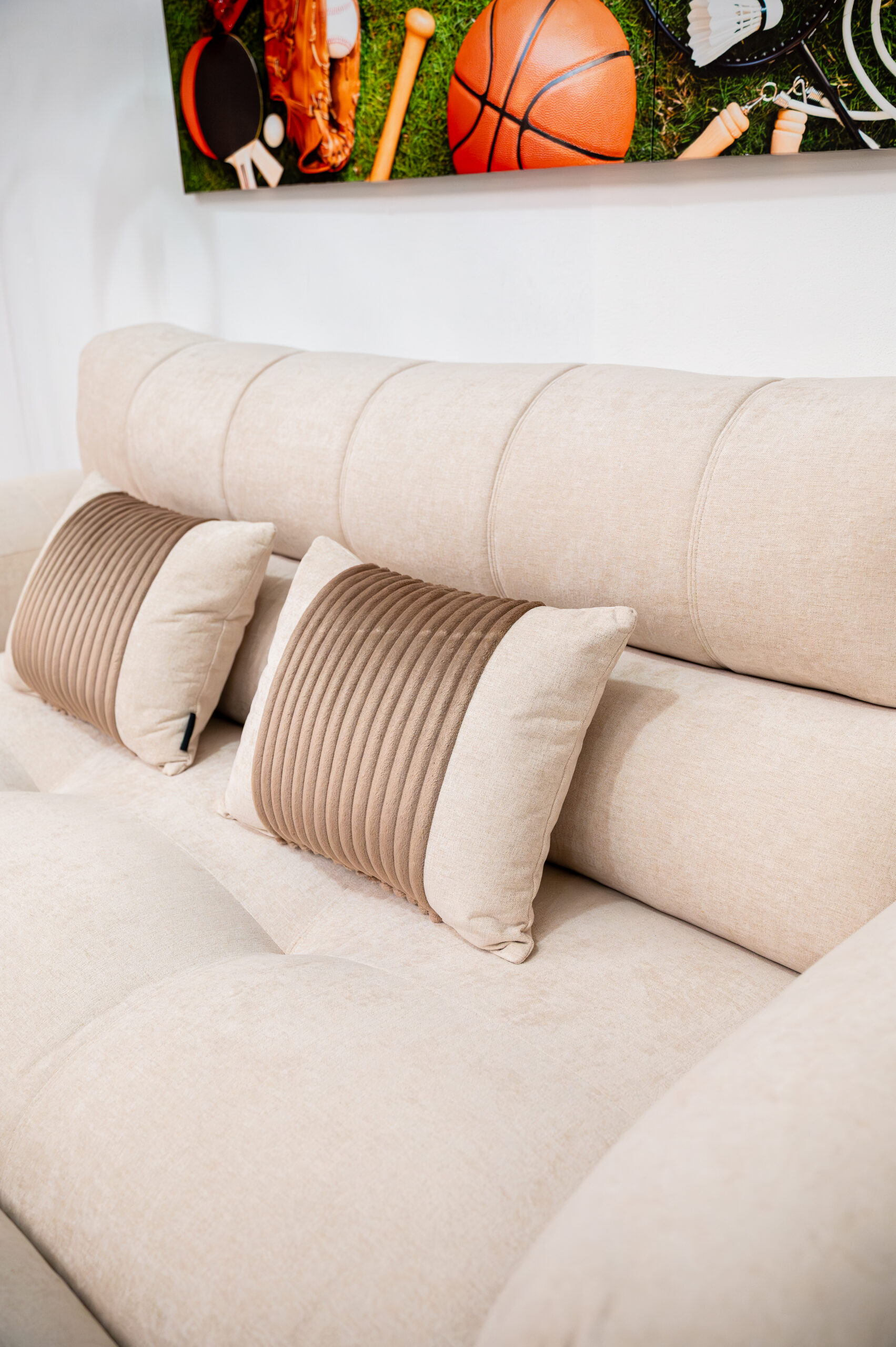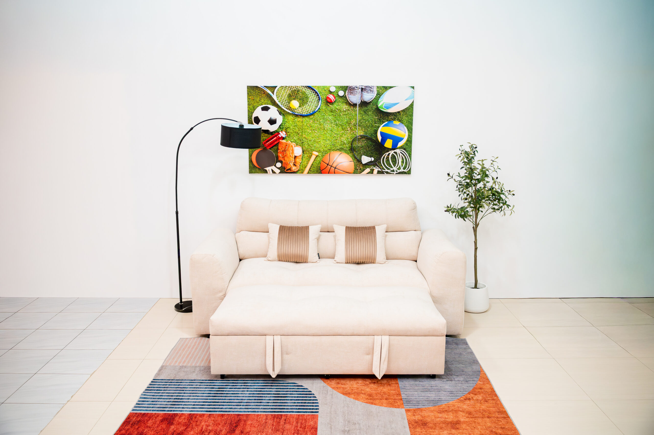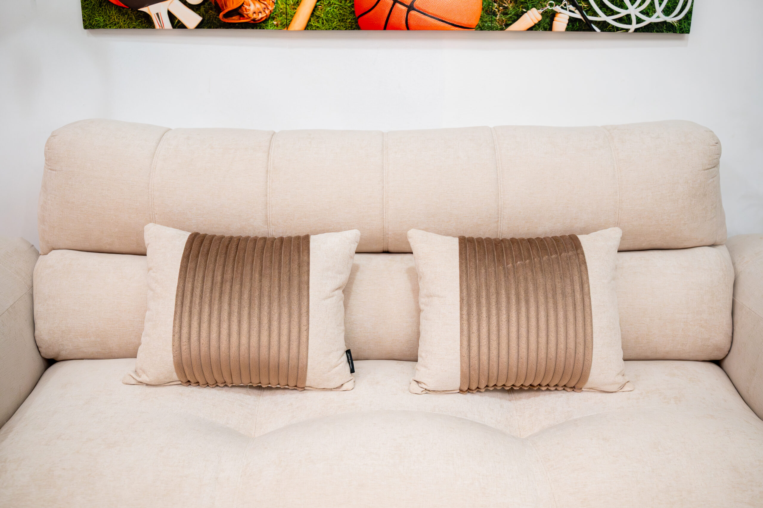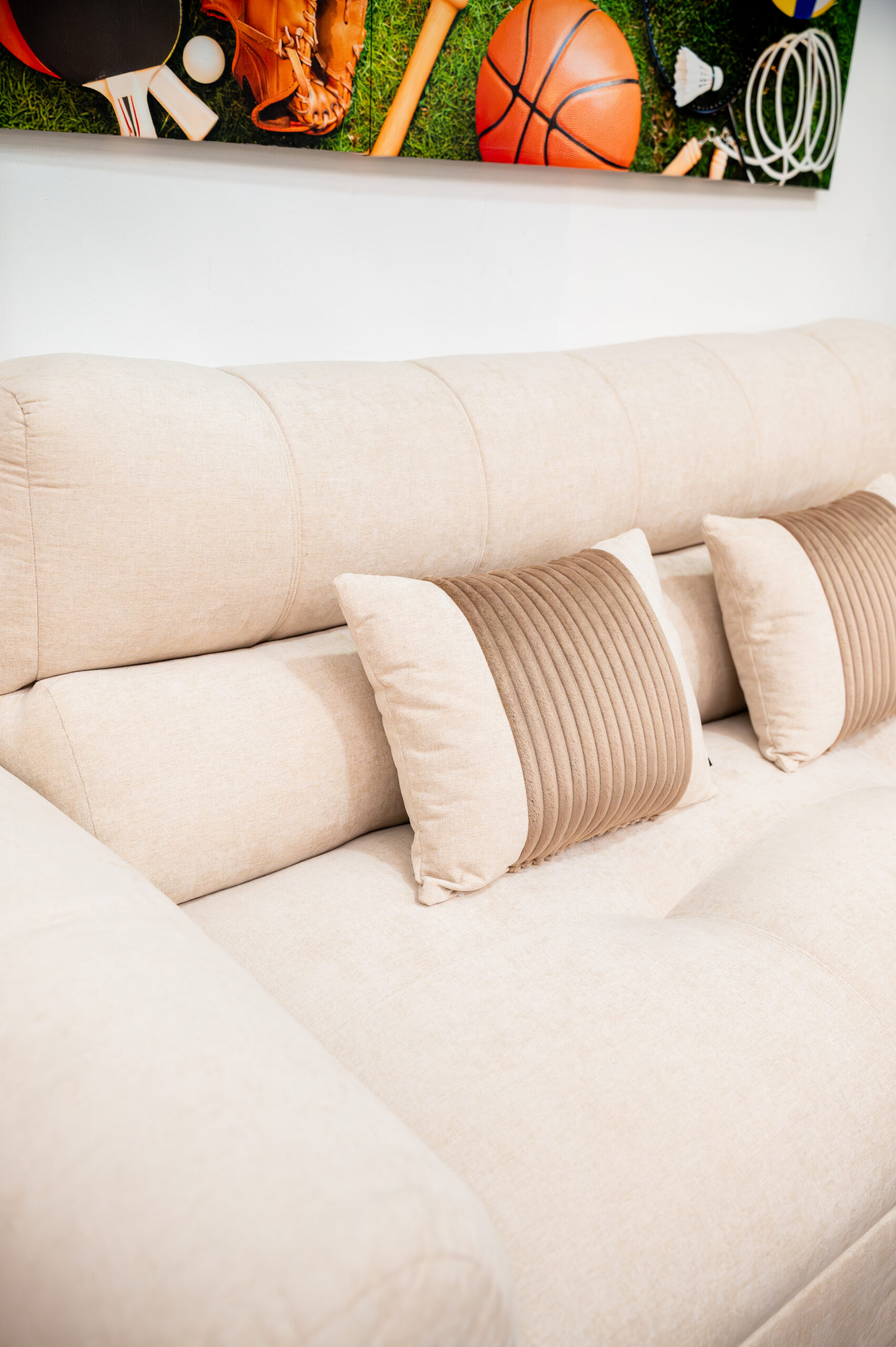 เนรมิตพื้นที่พักผ่อนให้กลายเป็นสวรรค์แห่งความนุ่มสบาย ด้วยโซฟาเบด 2 ที่นั่งดีไซน์มินิมอลสีครีมละมุนตา ที่มาพร้อมผิวสัมผัสของผ้าบุคุณภาพเยี่ยม ให้ความรู้สึกอบอุ่นและผ่อนคลายทุกครั้งที่เอนกาย โดดเด่นด้วยฟังก์ชัน “Space Saving” ที่ออกแบบมาอย่างชาญฉลาด สามารถดึงขยายจากโซฟานั่งเล่นให้กลายเป็นเตียงนอนกว้างขวางได้ในพริบตา พร้อมซ่อนฟังก์ชันพิเศษอย่างช่องเก็บของขนาดใหญ่ไว้ใต้เบาะสำหรับเก็บชุดเครื่องนอนหรือของใช้จุกจิก ช่วยให้ห้องดูเป็นระเบียบสะอาดตา เติมเต็มความสมบูรณ์แบบด้วยหมอนอิงดีไซน์เข้าชุดที่ตัดเย็บลวดลายเส้นริ้วสีน้ำตาล เพิ่มลูกเล่นให้ดูมีมิติ เป็นเฟอร์นิเจอร์ชิ้นเดียวที่ตอบโจทย์ครบทั้งการนั่ง นอน และจัดเก็บอย่างแท้จริง