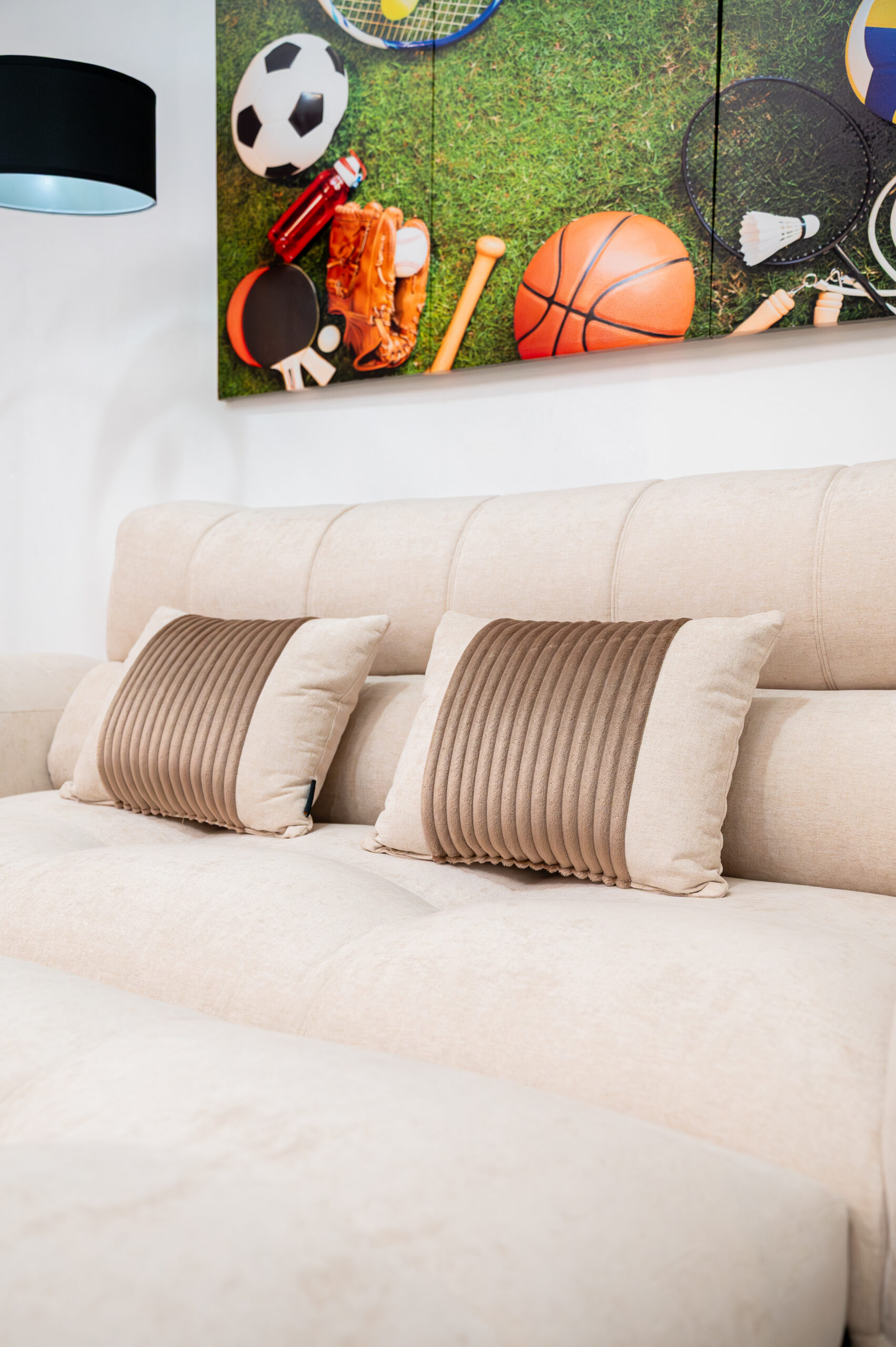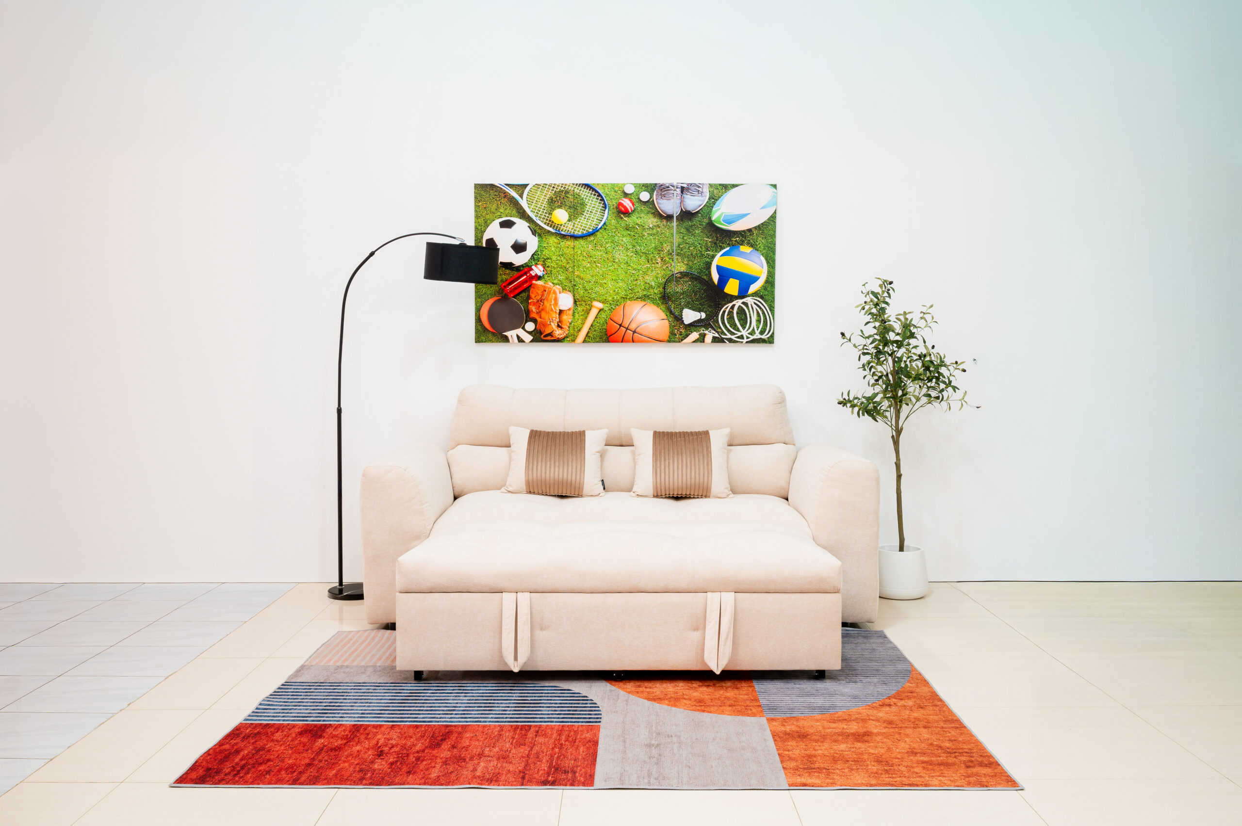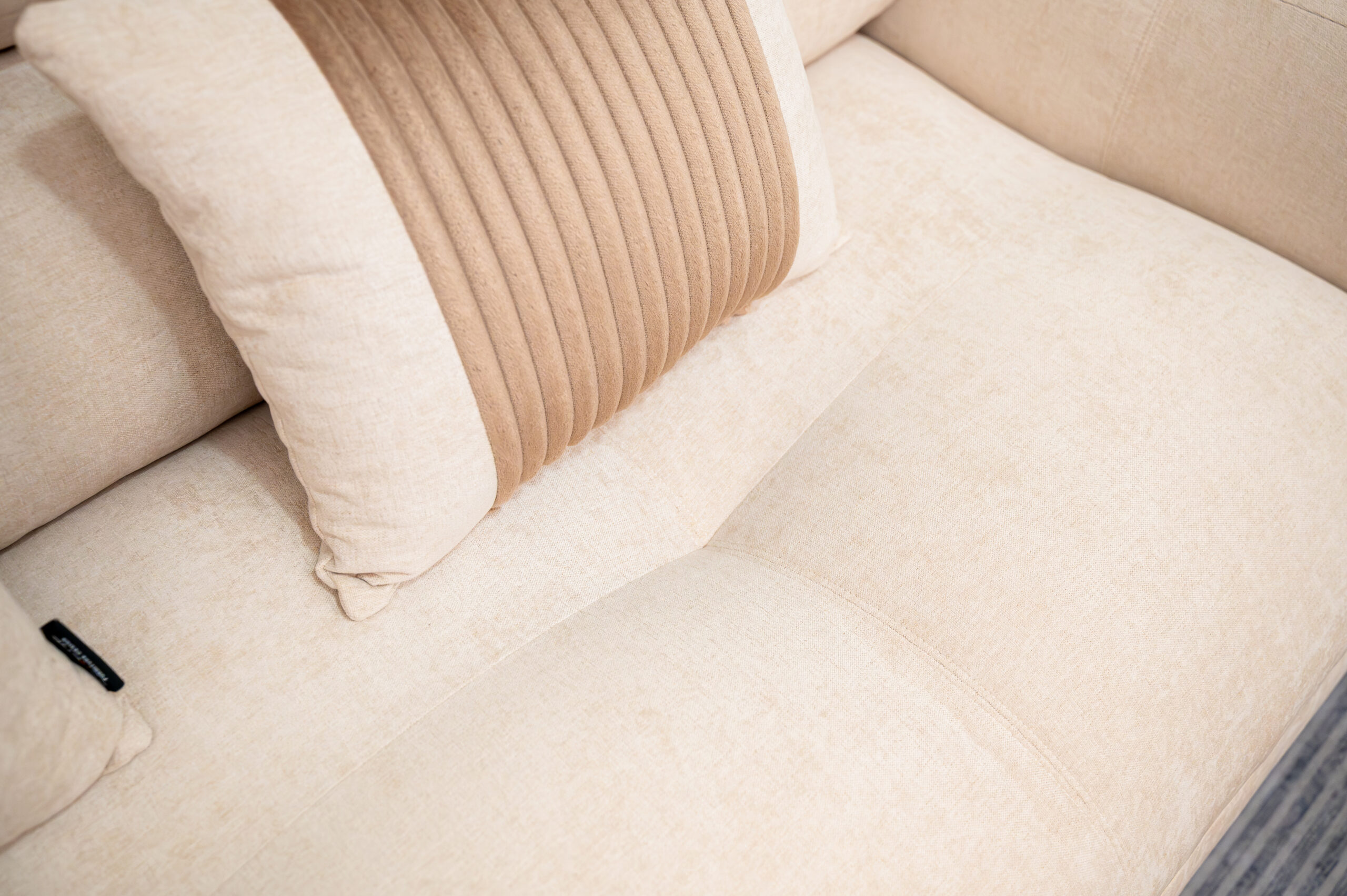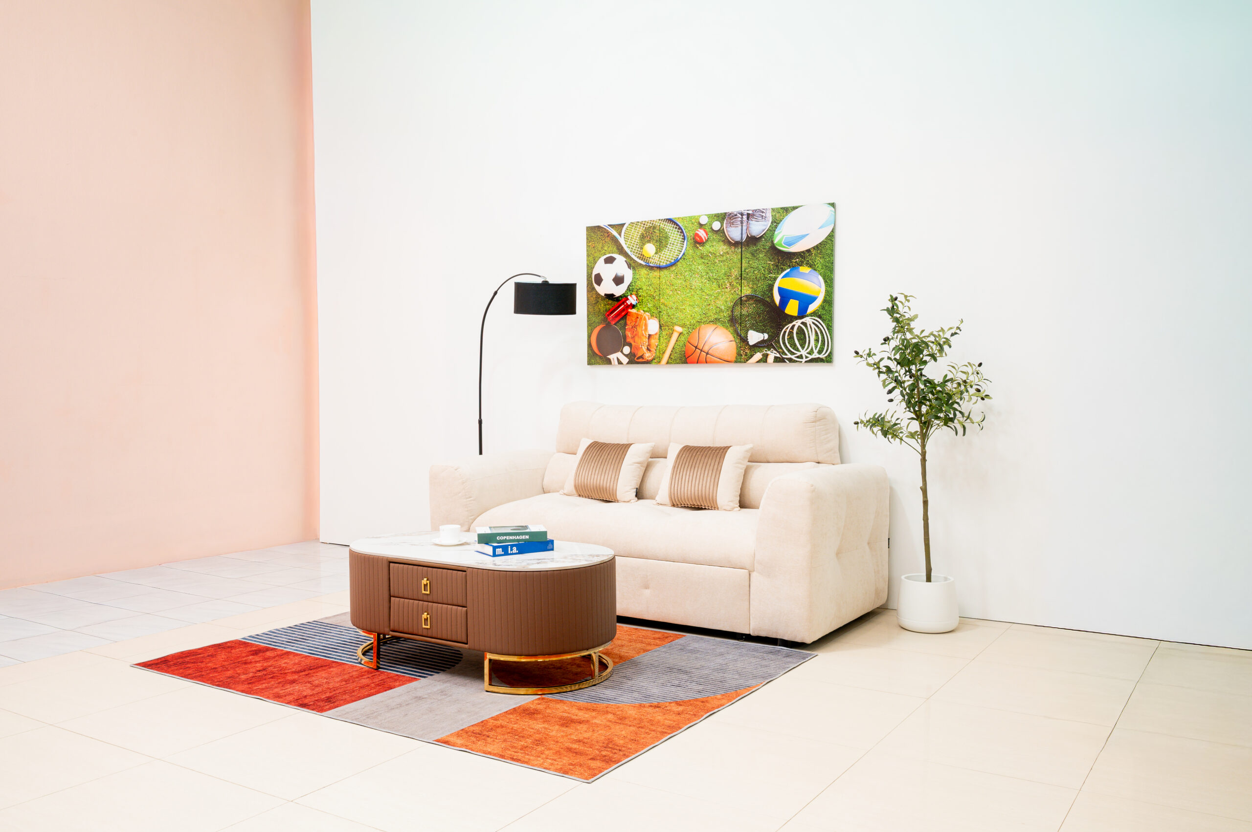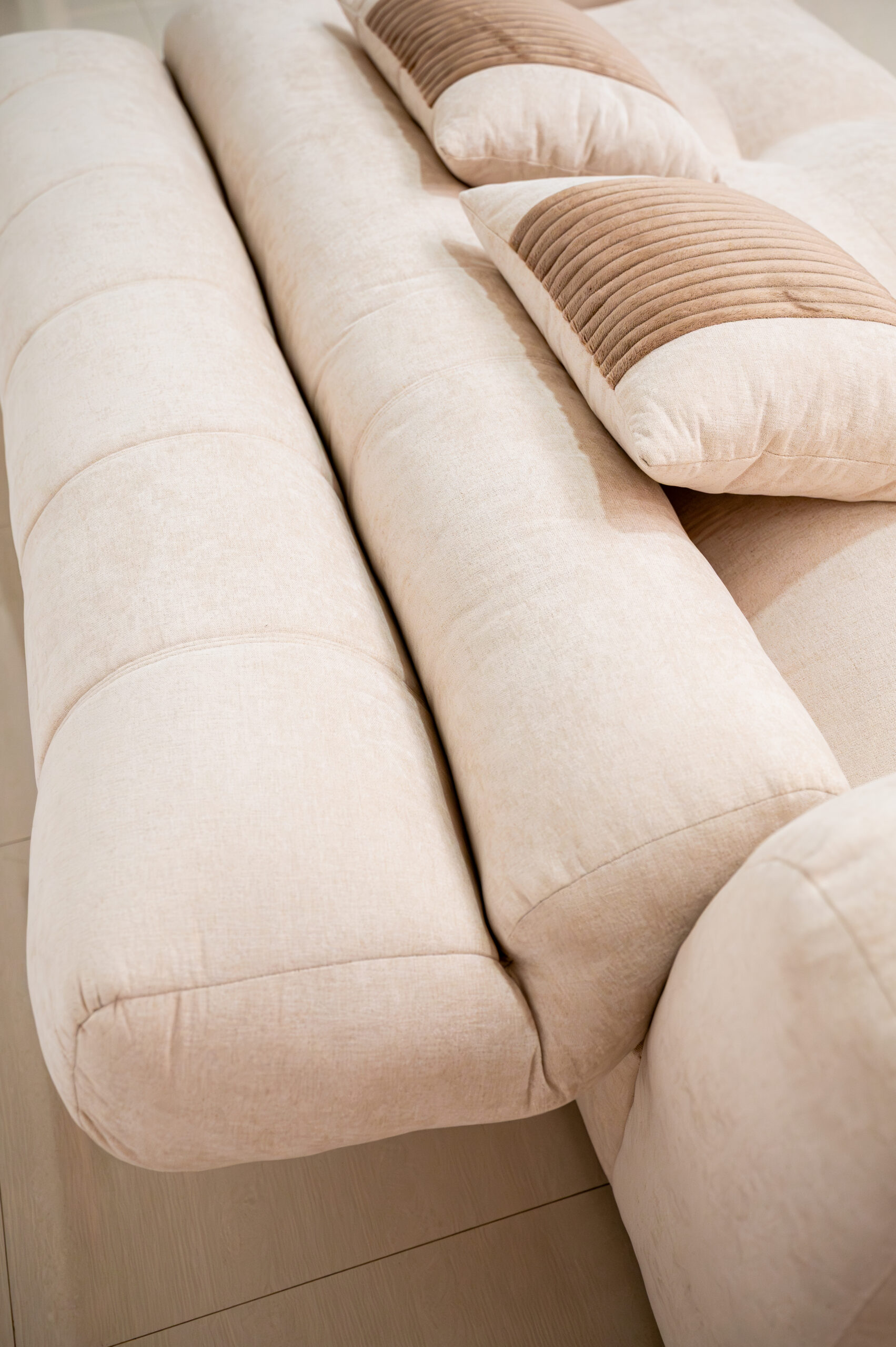 เนรมิตพื้นที่พักผ่อนให้กลายเป็นสวรรค์แห่งความนุ่มสบาย ด้วยโซฟาเบด 2 ที่นั่งดีไซน์มินิมอลสีครีมละมุนตา ที่มาพร้อมผิวสัมผัสของผ้าบุคุณภาพเยี่ยม ให้ความรู้สึกอบอุ่นและผ่อนคลายทุกครั้งที่เอนกาย โดดเด่นด้วยฟังก์ชัน “Space Saving” ที่ออกแบบมาอย่างชาญฉลาด สามารถดึงขยายจากโซฟานั่งเล่นให้กลายเป็นเตียงนอนกว้างขวางได้ในพริบตา พร้อมซ่อนฟังก์ชันพิเศษอย่างช่องเก็บของขนาดใหญ่ไว้ใต้เบาะสำหรับเก็บชุดเครื่องนอนหรือของใช้จุกจิก ช่วยให้ห้องดูเป็นระเบียบสะอาดตา เติมเต็มความสมบูรณ์แบบด้วยหมอนอิงดีไซน์เข้าชุดที่ตัดเย็บลวดลายเส้นริ้วสีน้ำตาล เพิ่มลูกเล่นให้ดูมีมิติ เป็นเฟอร์นิเจอร์ชิ้นเดียวที่ตอบโจทย์ครบทั้งการนั่ง นอน และจัดเก็บอย่างแท้จริง