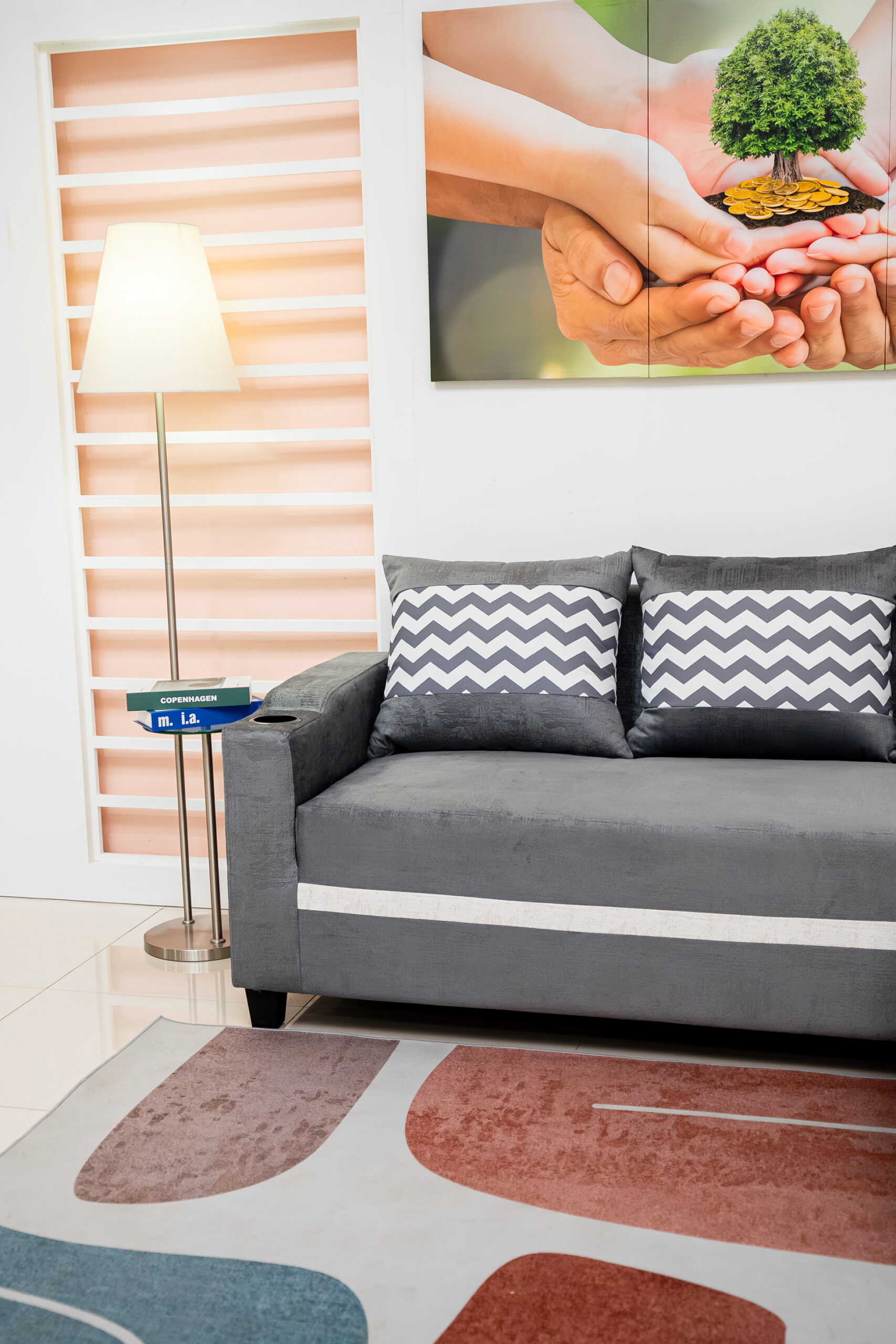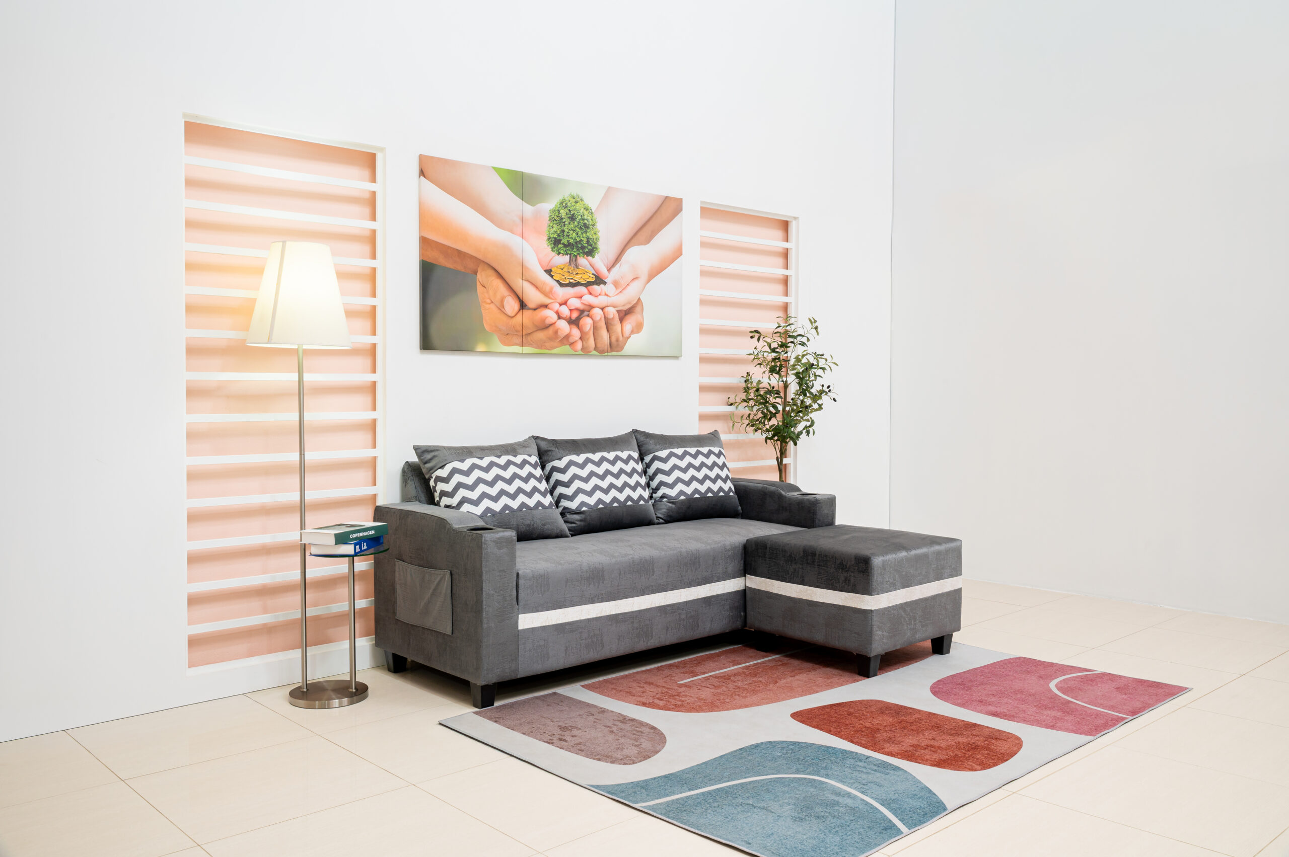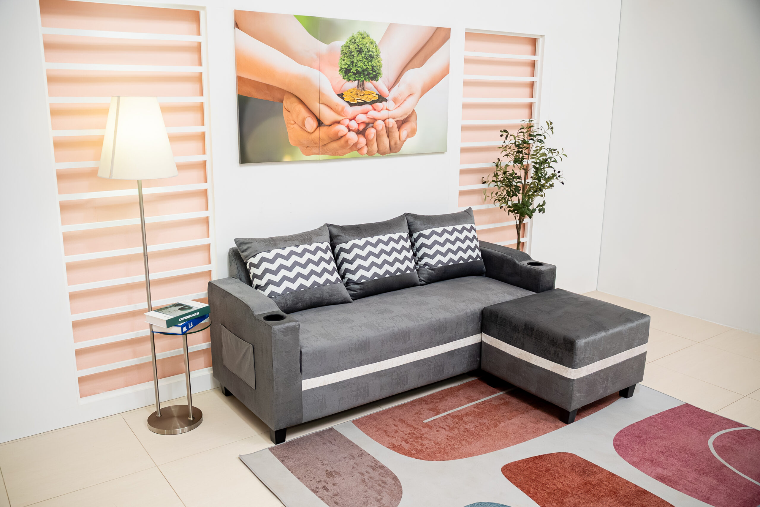 เปลี่ยนบรรยากาศห้องนั่งเล่นให้ดูโฉบเฉี่ยวและมีสไตล์ ด้วยโซฟาเบดเข้ามุม L-Shape สีเทาชาร์โคลที่หุ้มด้วยผ้าเทกเจอร์ลายหนัง (Leather Look) ให้ความรู้สึกเท่ ทนทาน และดูแลรักษาง่าย โดดเด่นด้วยการตกแต่งหมอนอิงลวดลายกราฟิก Chevron (ลายฟันปลา) ขาว-ดำ ที่ช่วยตัดความขรึมของสีพื้นให้ดูสนุกและทันสมัยขึ้น พร้อมเดินเส้นแถบสีครีมบริเวณฐานเพื่อเพิ่มจุดนำสายตา มาพร้อมฟังก์ชัน “Smart Living” ครบครัน ทั้งช่องวางแก้วน้ำสแตนเลส กระเป๋าเก็บของด้านข้าง และสตูลอิสระที่ปรับเปลี่ยนการจัดวางได้ตามพื้นที่ใช้สอย ตอบโจทย์ไลฟ์สไตล์คนรุ่นใหม่ที่ต้องการทั้งดีไซน์และฟังก์ชันในชิ้นเดียว