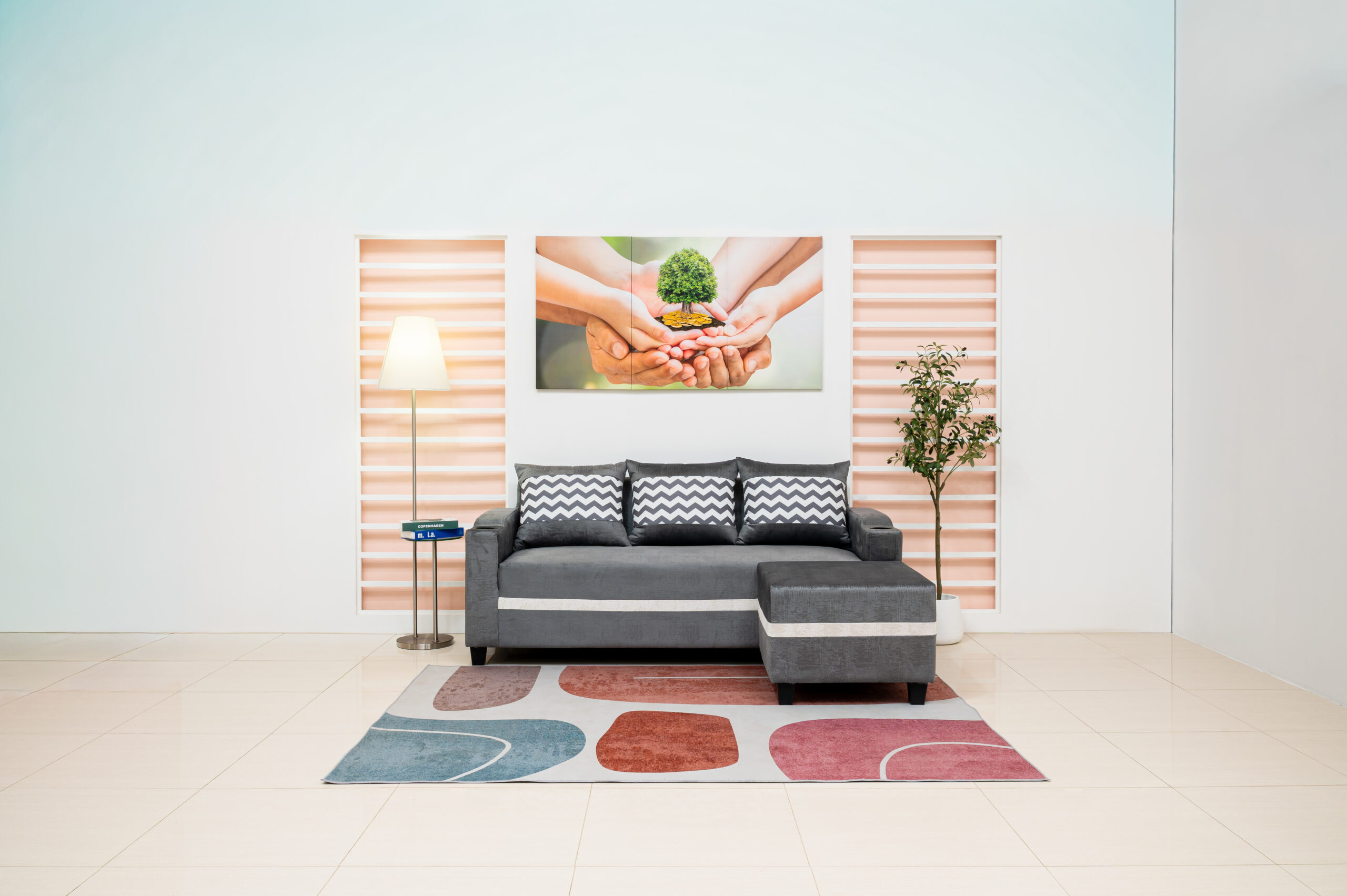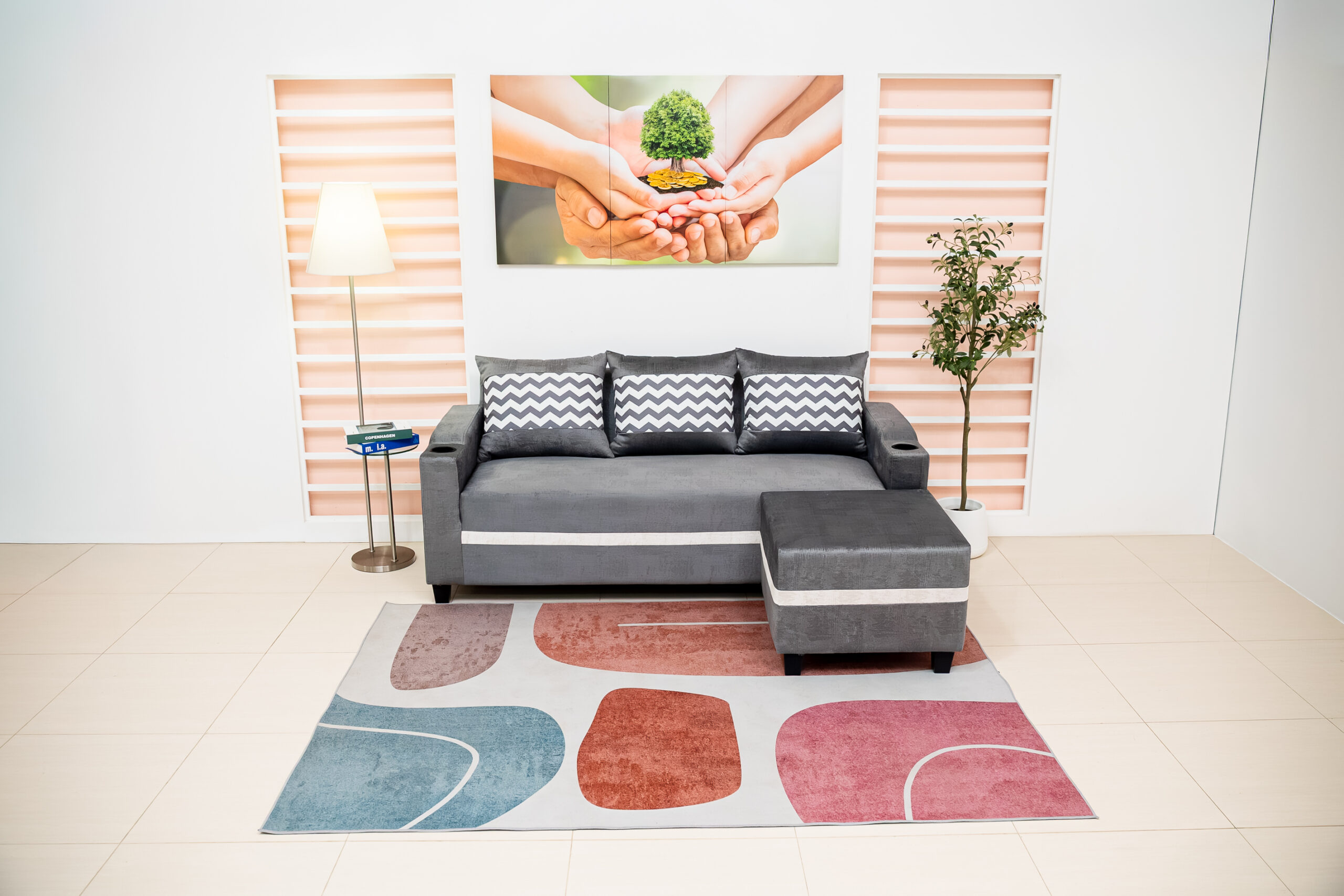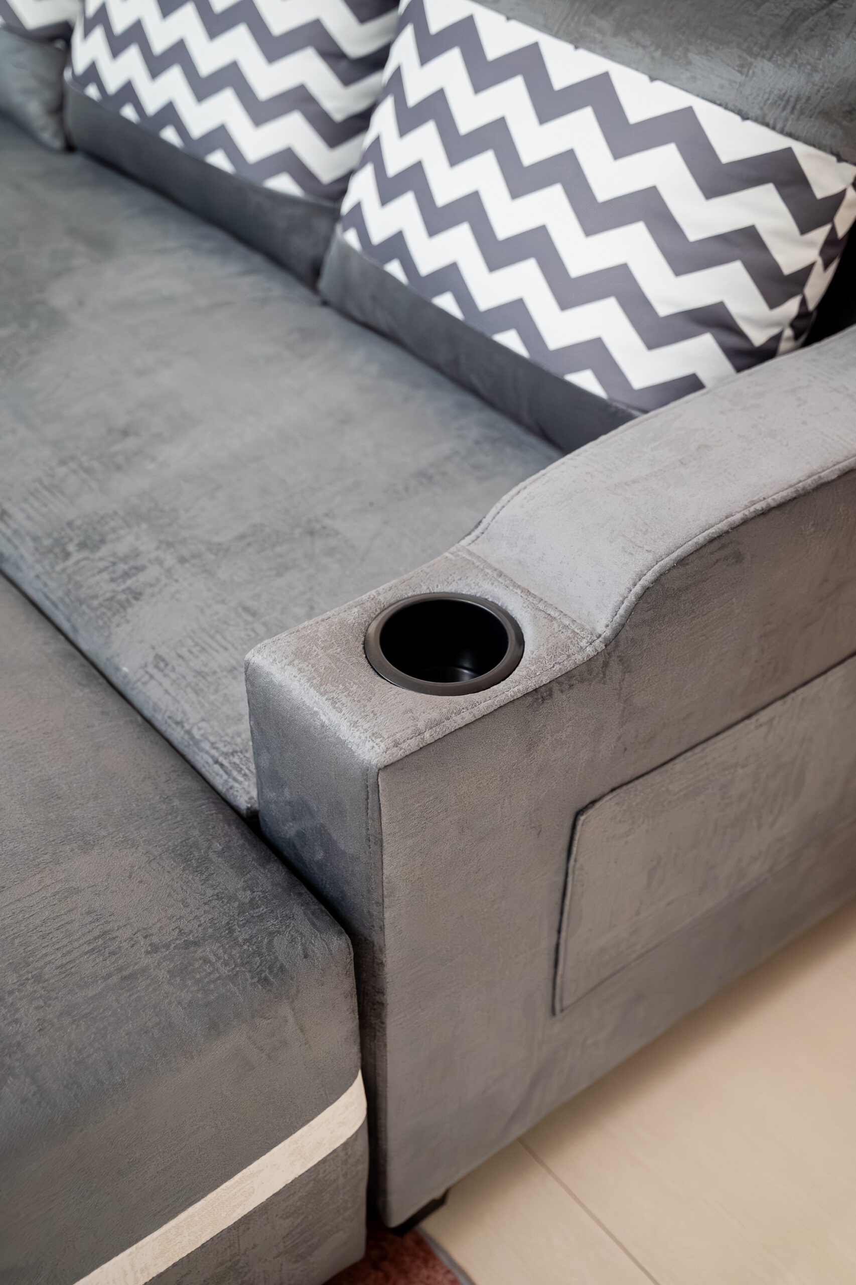 เปลี่ยนบรรยากาศห้องนั่งเล่นให้ดูโฉบเฉี่ยวและมีสไตล์ ด้วยโซฟาเบดเข้ามุม L-Shape สีเทาชาร์โคลที่หุ้มด้วยผ้าเทกเจอร์ลายหนัง (Leather Look) ให้ความรู้สึกเท่ ทนทาน และดูแลรักษาง่าย โดดเด่นด้วยการตกแต่งหมอนอิงลวดลายกราฟิก Chevron (ลายฟันปลา) ขาว-ดำ ที่ช่วยตัดความขรึมของสีพื้นให้ดูสนุกและทันสมัยขึ้น พร้อมเดินเส้นแถบสีครีมบริเวณฐานเพื่อเพิ่มจุดนำสายตา มาพร้อมฟังก์ชัน “Smart Living” ครบครัน ทั้งช่องวางแก้วน้ำสแตนเลส กระเป๋าเก็บของด้านข้าง และสตูลอิสระที่ปรับเปลี่ยนการจัดวางได้ตามพื้นที่ใช้สอย ตอบโจทย์ไลฟ์สไตล์คนรุ่นใหม่ที่ต้องการทั้งดีไซน์และฟังก์ชันในชิ้นเดียว
