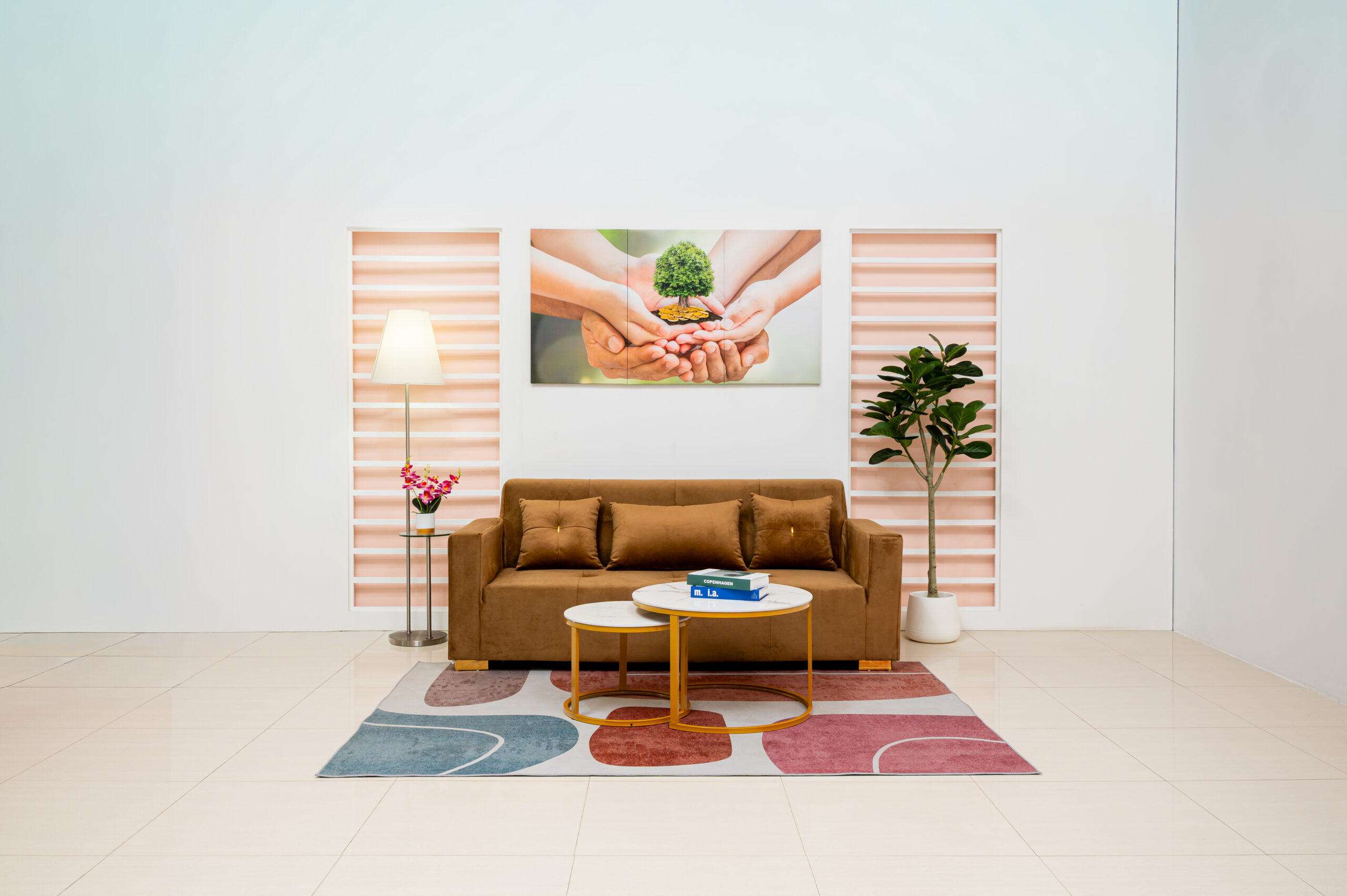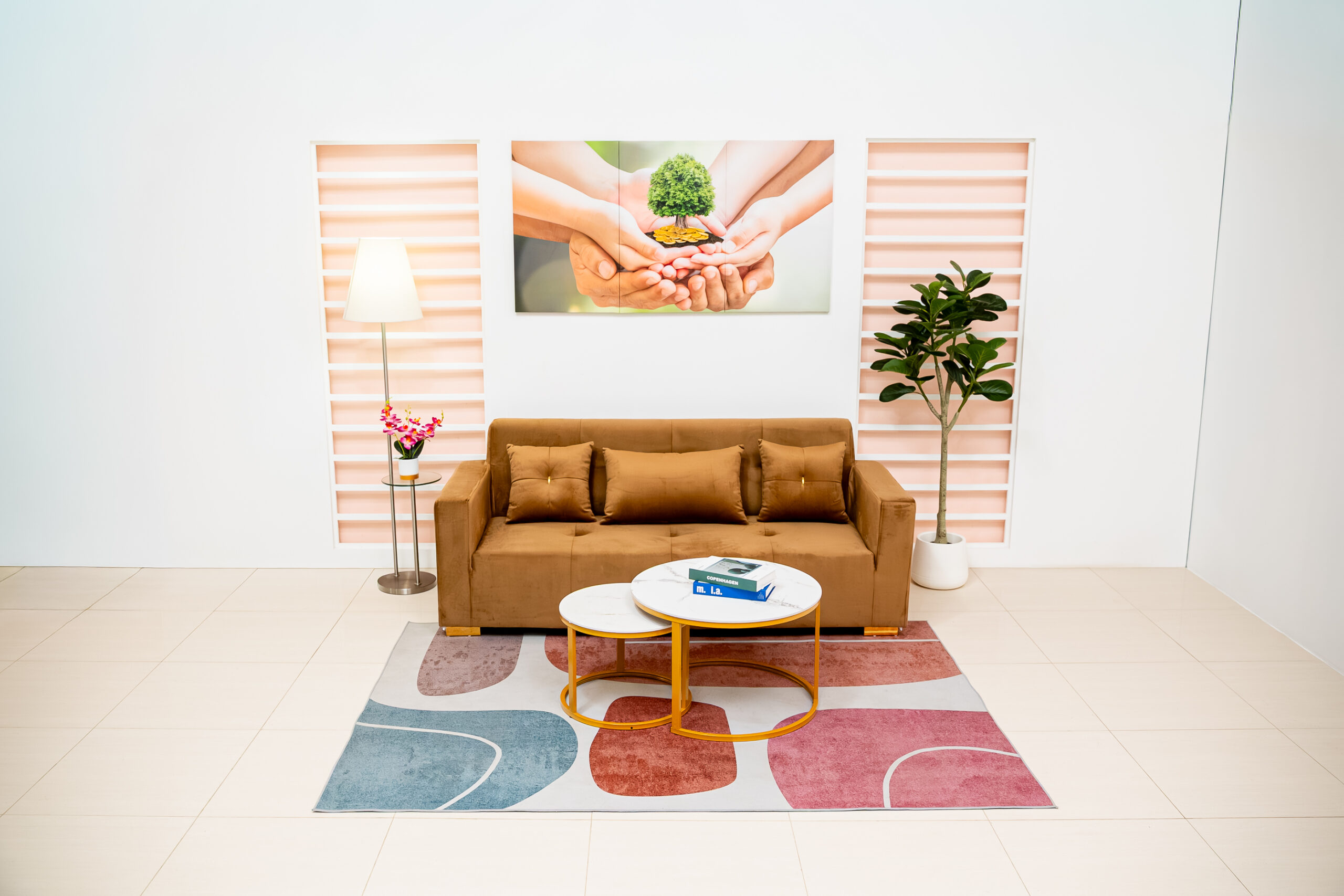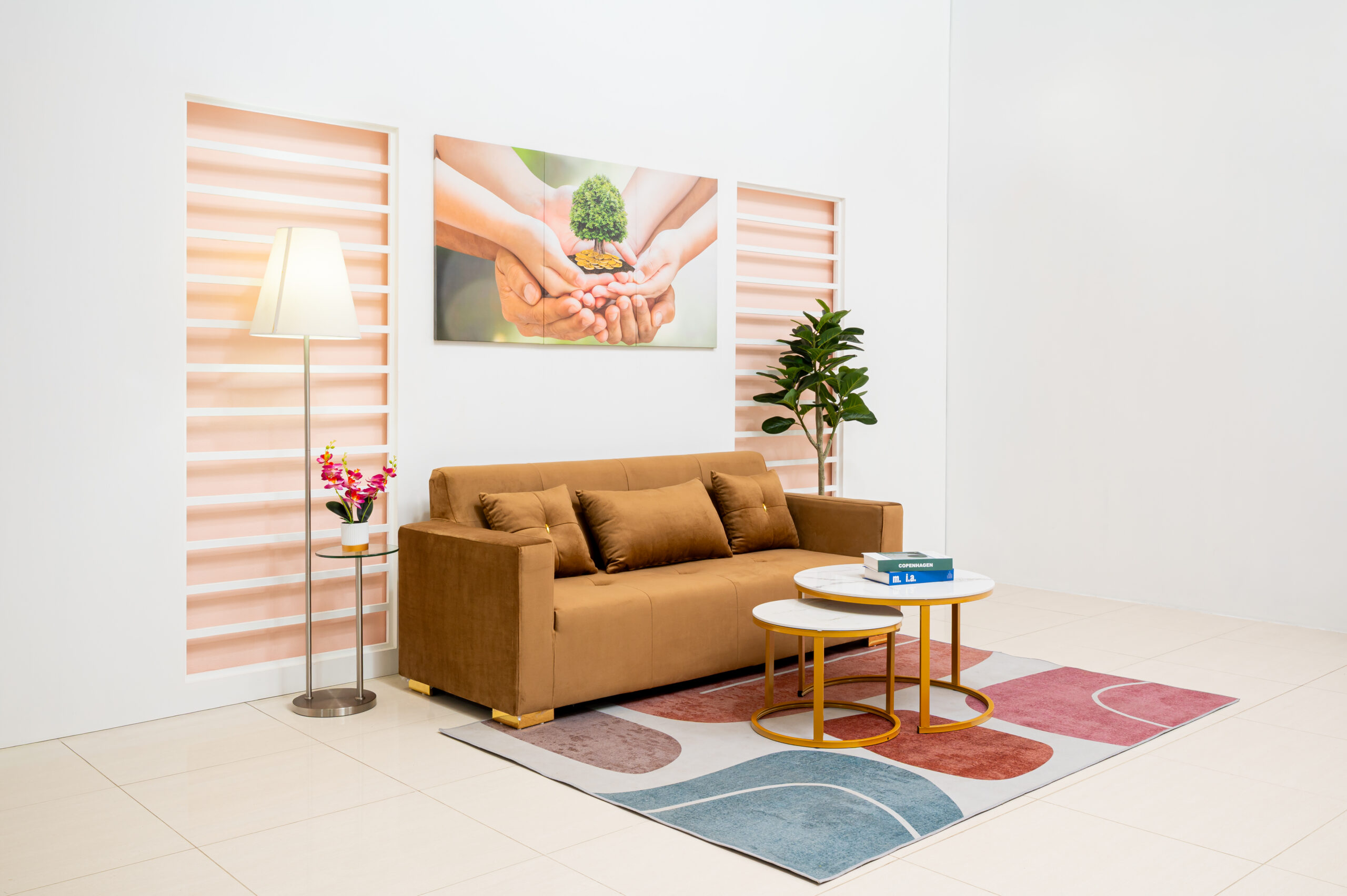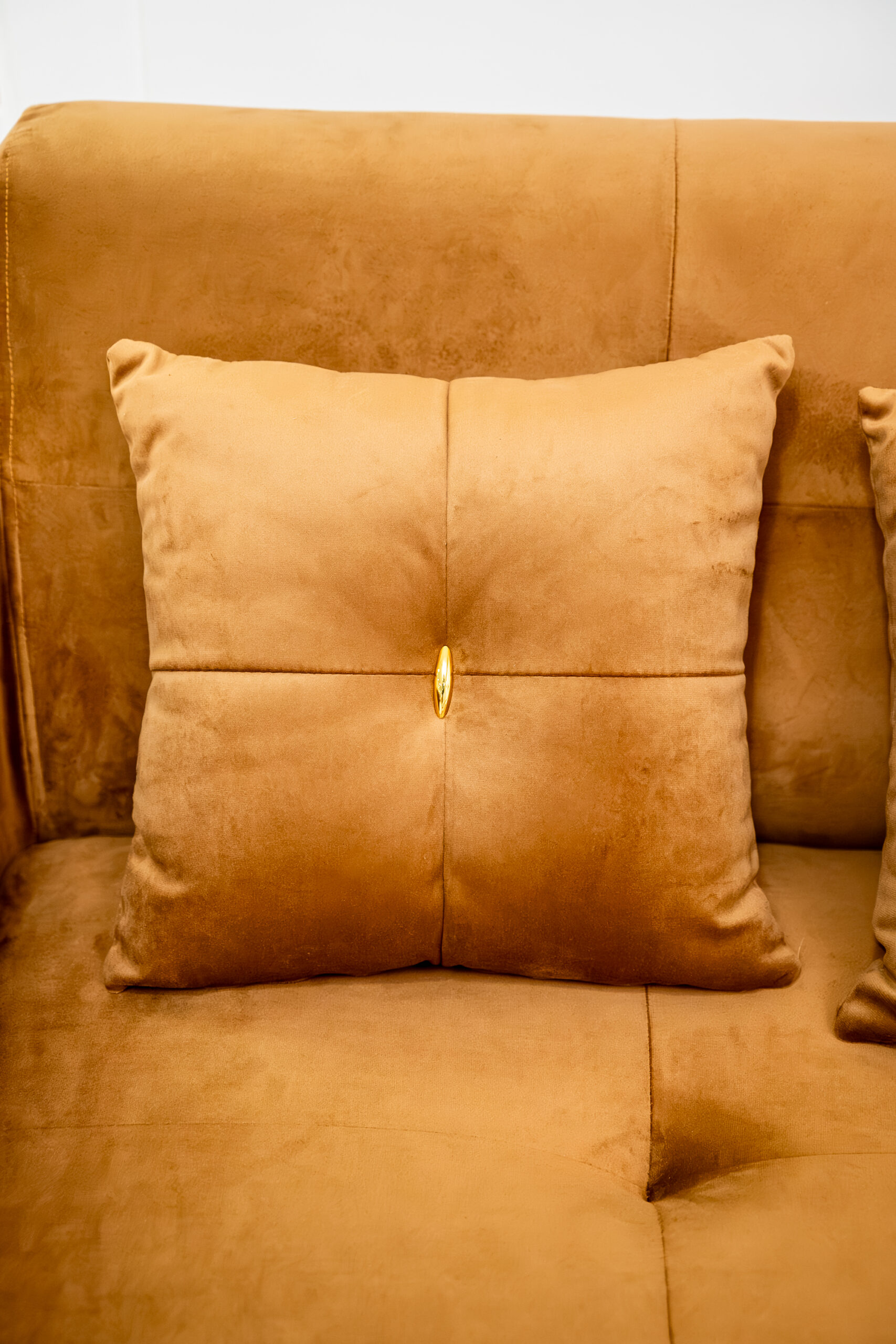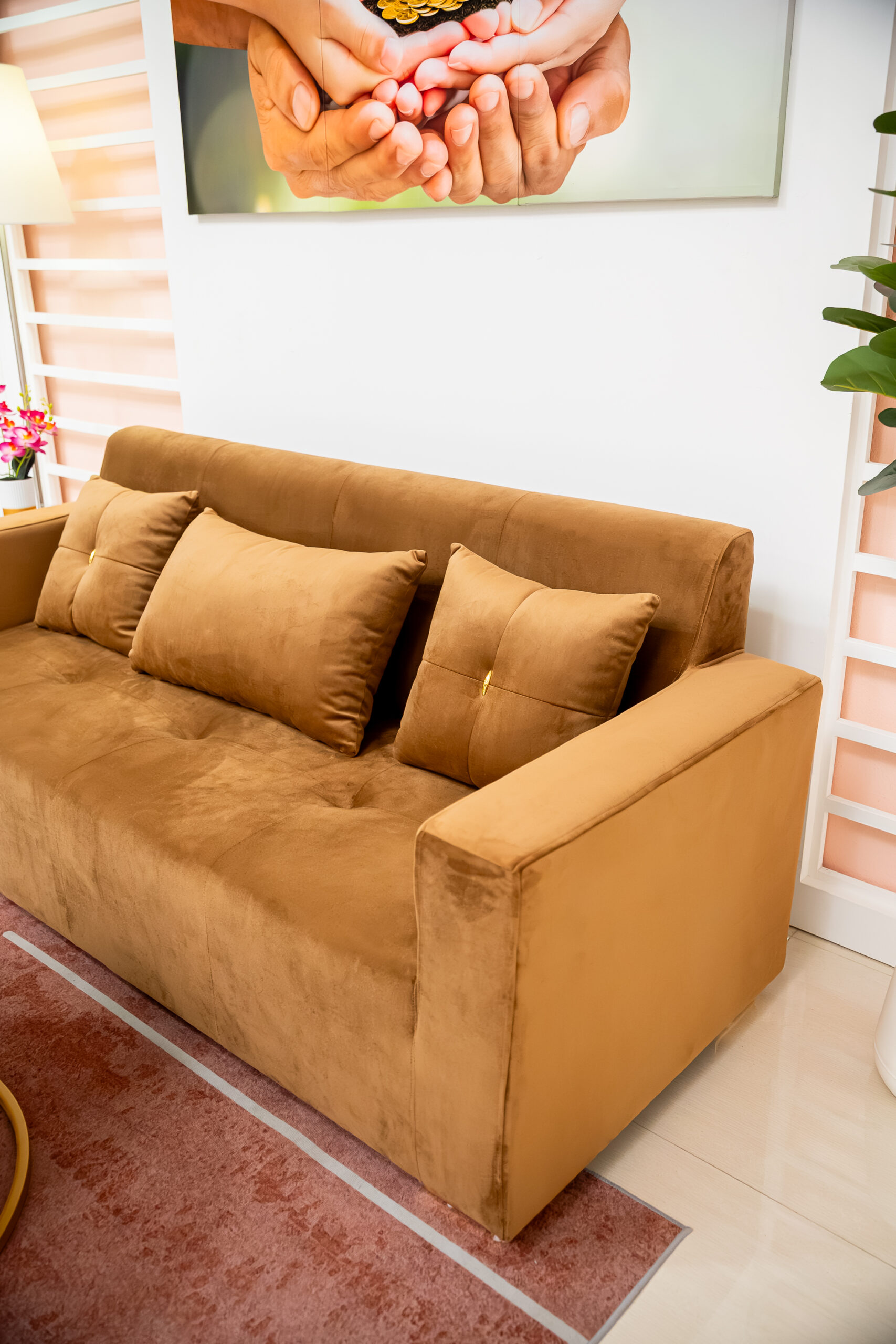 เปลี่ยนห้องรับแขกให้ดูหรูหราและอบอุ่นในคราวเดียว ด้วยโซฟา 3 ที่นั่งหุ้มผ้ากำมะหยี่สีน้ำตาลทอง (Golden Brown) ที่ให้สัมผัสนุ่มลื่นและเล่นแสงสวยงาม โดดเด่นด้วยดีเทลการตกแต่งอะไหล่สีทองเงาวับ ทั้งบริเวณขาโซฟาทรงเหลี่ยมและกระดุมกลางหมอนอิง ช่วยขับเน้นความแพงและสง่างามตามแบบฉบับ Modern Luxury ตัดกับรูปทรงโซฟาที่ดูโมเดิร์นเรียบง่าย ทำให้ห้องดูภูมิฐานแต่ไม่รู้สึกอึดอัด แมตช์คู่กับโต๊ะกลางท็อปหินอ่อนขาโลหะทองยิ่งส่งเสริมให้ภาพรวมของห้องดูสวยตะลึงและมีรสนิยม