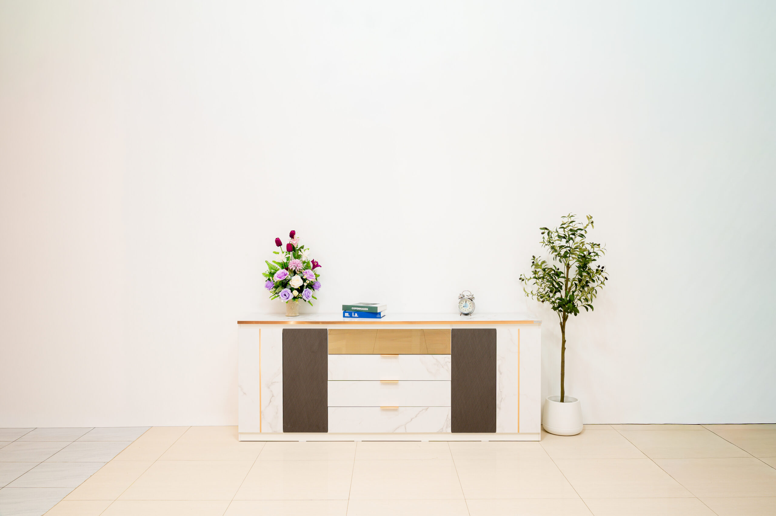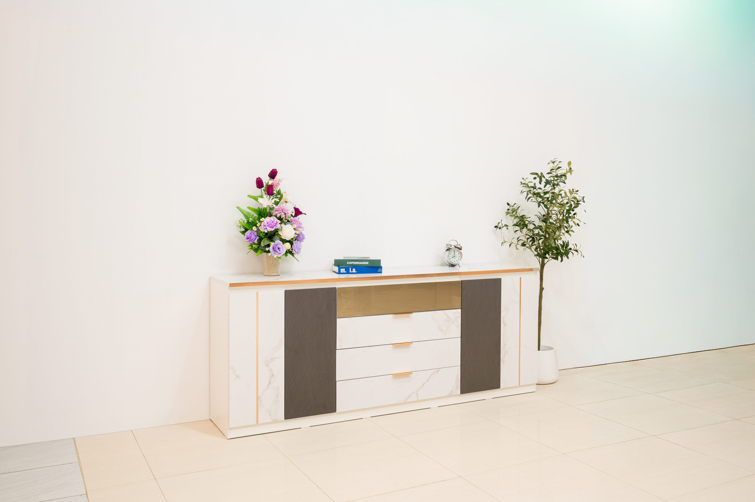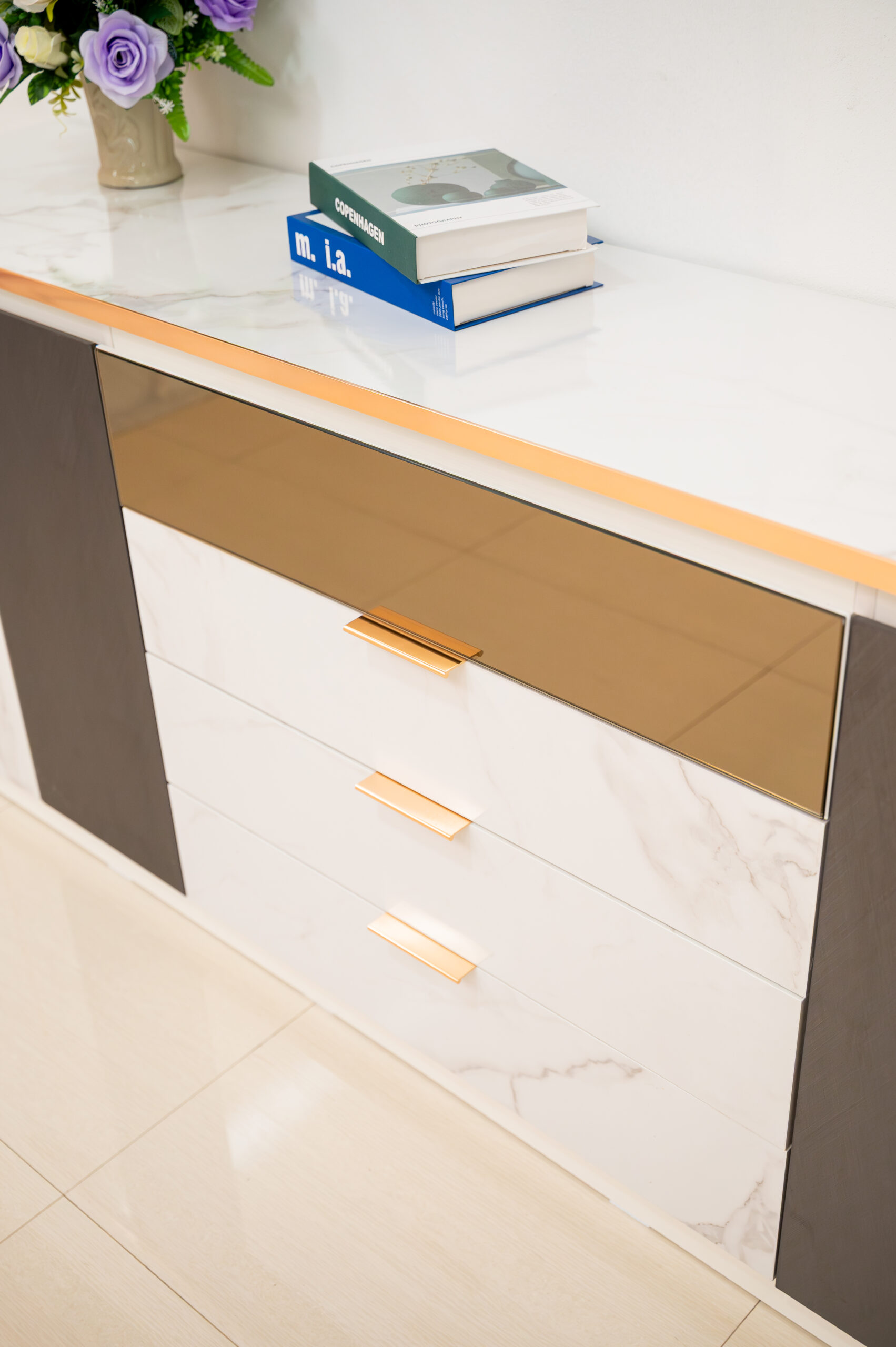 ยกระดับห้องนั่งเล่นให้ดูแพงและมีรสนิยมด้วยตู้ไซด์บอร์ดดีไซน์หรูที่ผสานความงามของลายหินอ่อนสีขาวเข้ากับความเท่ขรึมของเทกเจอร์สีเทาเข้มได้อย่างลงตัว โดดเด่นด้วยงานดีไซน์ที่ใส่ใจในทุกรายละเอียด ตั้งแต่การเดินเส้นขอบคิ้วและมือจับสแตนเลสสี Pink Gold เงางามที่ช่วยขับเน้นความพรีเมียม ไปจนถึงไฮไลท์พิเศษอย่างหน้าบานลิ้นชักบนที่เป็นกระจกเงาสีทอง (Gold Mirror) ช่วยเพิ่มมิติให้เฟอร์นิเจอร์ดูโปร่งและน่าค้นหา มาพร้อมฟังก์ชันจัดเก็บที่ครบครันทั้งลิ้นชักและตู้บานเปิด เป็น Masterpiece ที่วางเพียงชิ้นเดียวก็สามารถเปลี่ยนบรรยากาศบ้านธรรมดาให้ดูหรูหราเหมือนห้องตัวอย่าง