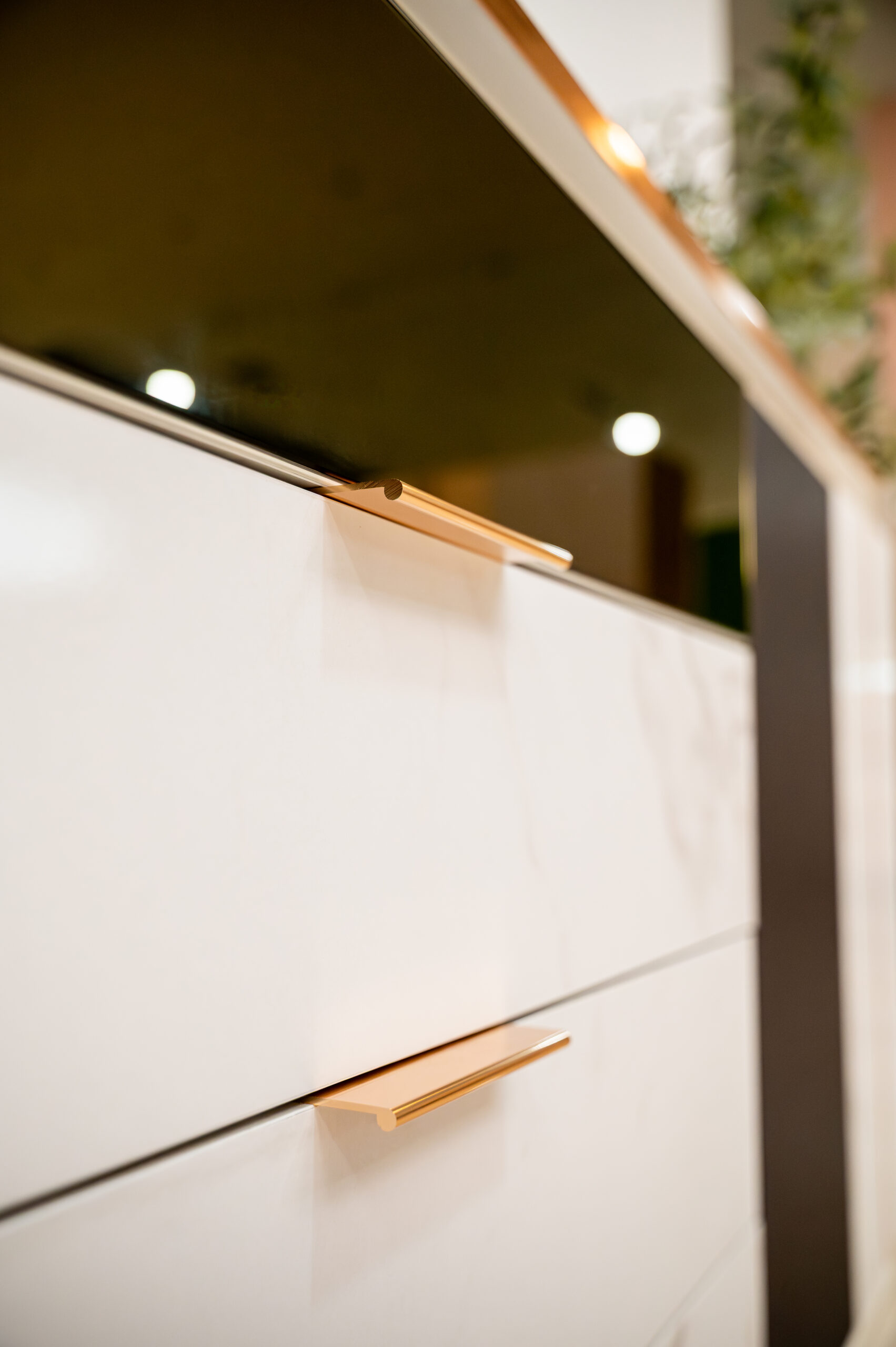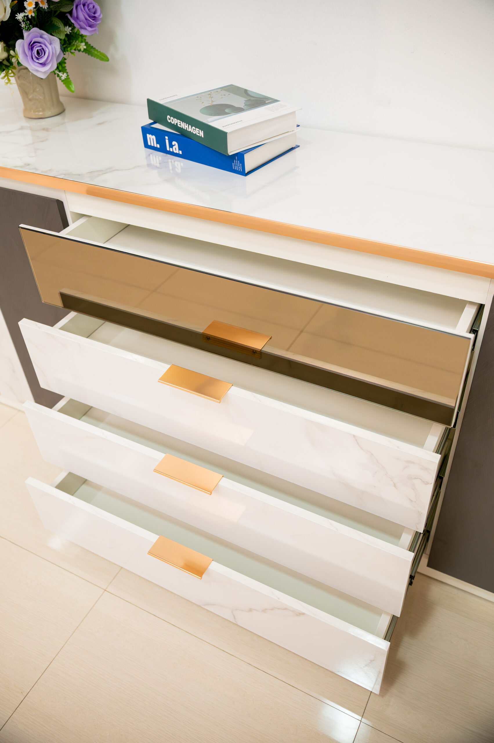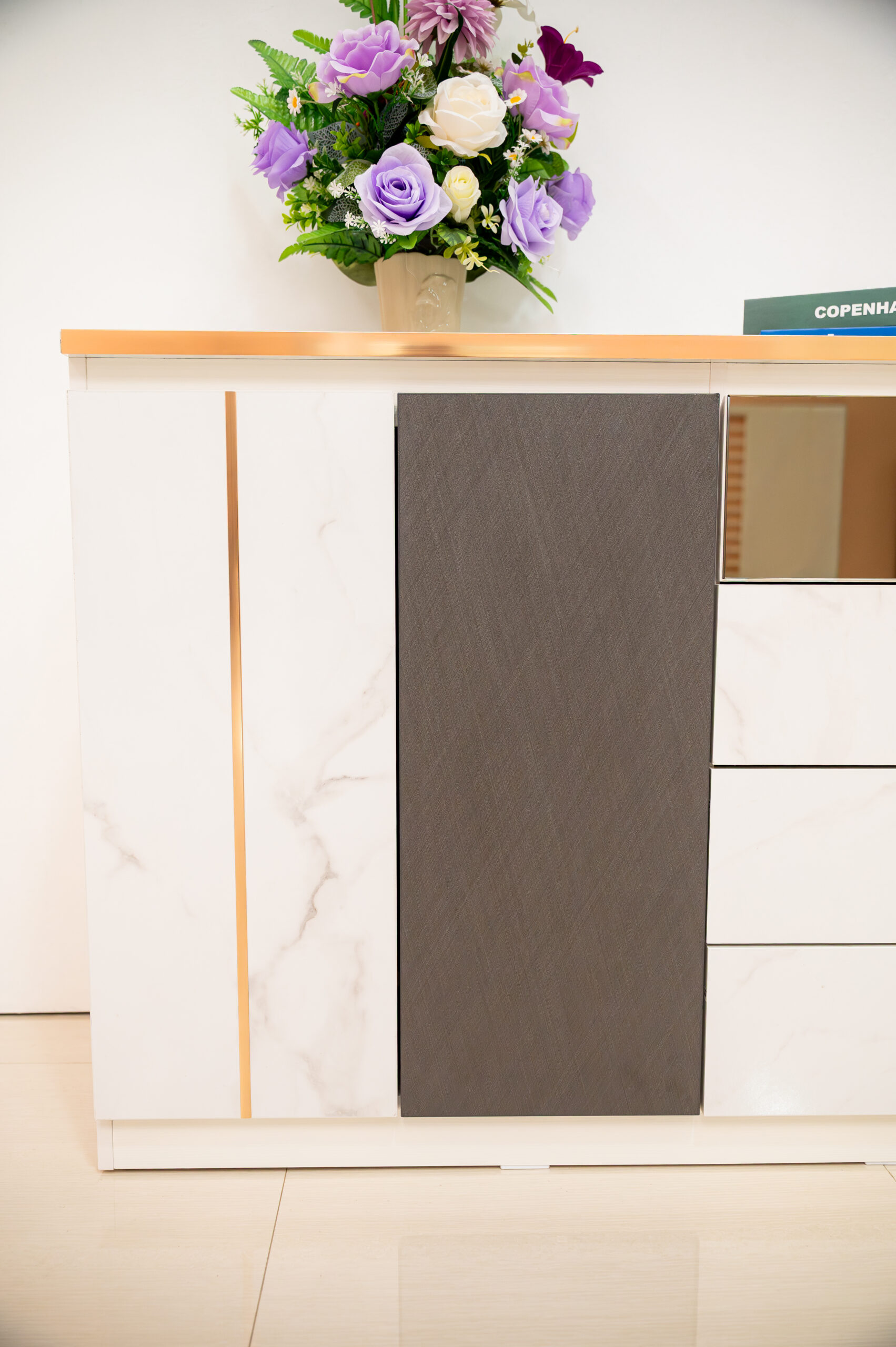 ยกระดับห้องนั่งเล่นให้ดูแพงและมีรสนิยมด้วยตู้ไซด์บอร์ดดีไซน์หรูที่ผสานความงามของลายหินอ่อนสีขาวเข้ากับความเท่ขรึมของเทกเจอร์สีเทาเข้มได้อย่างลงตัว โดดเด่นด้วยงานดีไซน์ที่ใส่ใจในทุกรายละเอียด ตั้งแต่การเดินเส้นขอบคิ้วและมือจับสแตนเลสสี Pink Gold เงางามที่ช่วยขับเน้นความพรีเมียม ไปจนถึงไฮไลท์พิเศษอย่างหน้าบานลิ้นชักบนที่เป็นกระจกเงาสีทอง (Gold Mirror) ช่วยเพิ่มมิติให้เฟอร์นิเจอร์ดูโปร่งและน่าค้นหา มาพร้อมฟังก์ชันจัดเก็บที่ครบครันทั้งลิ้นชักและตู้บานเปิด เป็น Masterpiece ที่วางเพียงชิ้นเดียวก็สามารถเปลี่ยนบรรยากาศบ้านธรรมดาให้ดูหรูหราเหมือนห้องตัวอย่าง